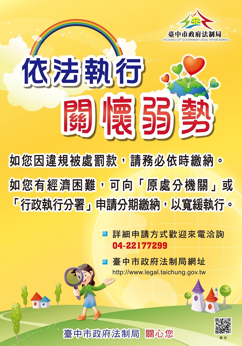 為幫助弱勢受處分人能夠重新站起來,陳局長指出,依「台中市政府所屬各機關學校行政罰鍰案件作業要點」,針對因經濟狀況、天災事故而無法一次繳納行政罰鍰的民眾,只要填具申請書並檢附相關證明文件,即可向原處分機關申請分期繳納,如已移送行政執行署各分署執行的案件,則需向分署提出申請。