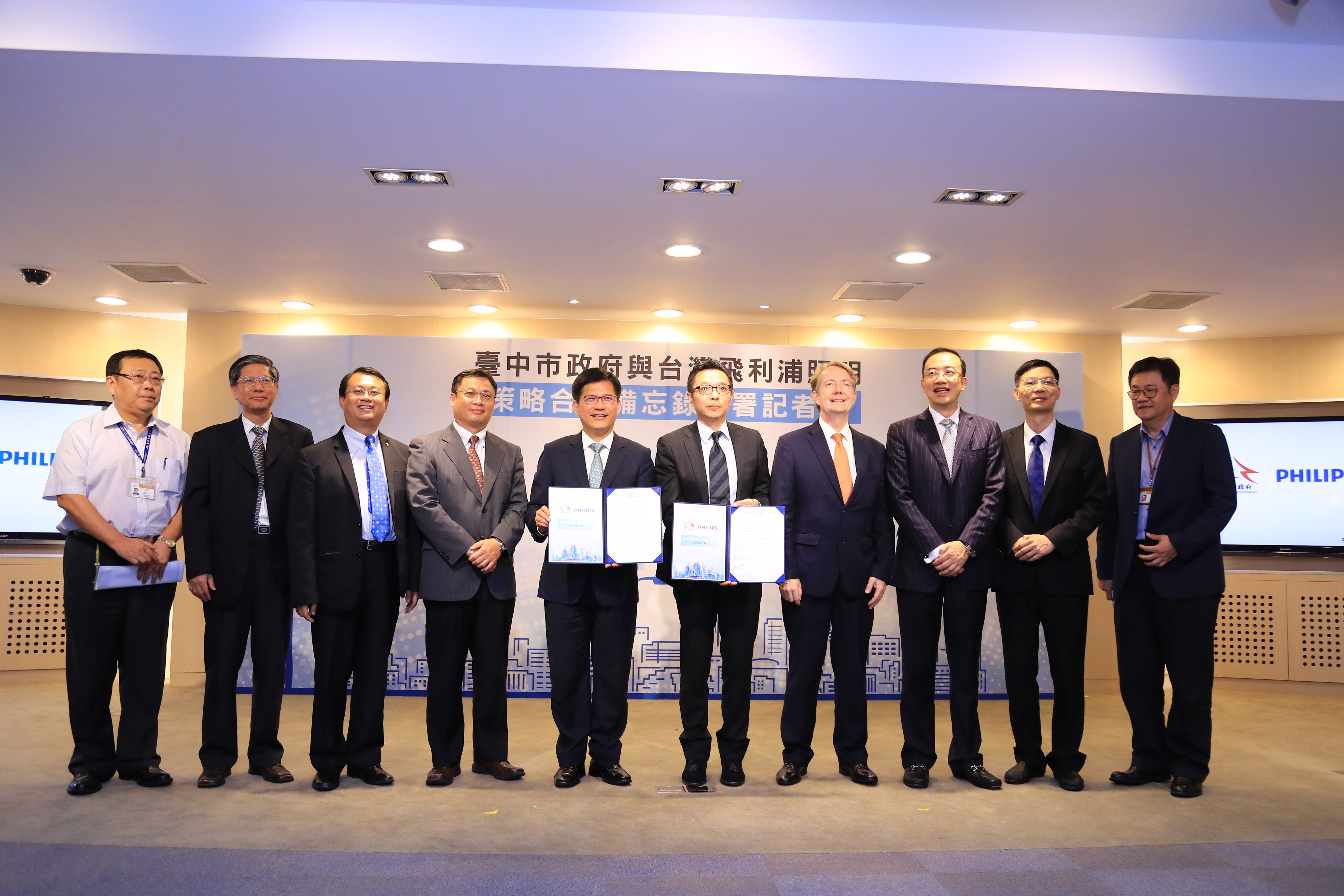 市府經濟發展局今日在台灣大道市政大樓舉辦合作備忘錄簽署儀式,由林市長與台灣飛利浦照明副總裁暨總經理余泳濤簽署合作備忘錄,市府副秘書長郭坤明、經發局長呂曜志、飛利浦照明大中華區總裁王昀、荷蘭貿易暨投資辦事處代表紀維德均到場見證。