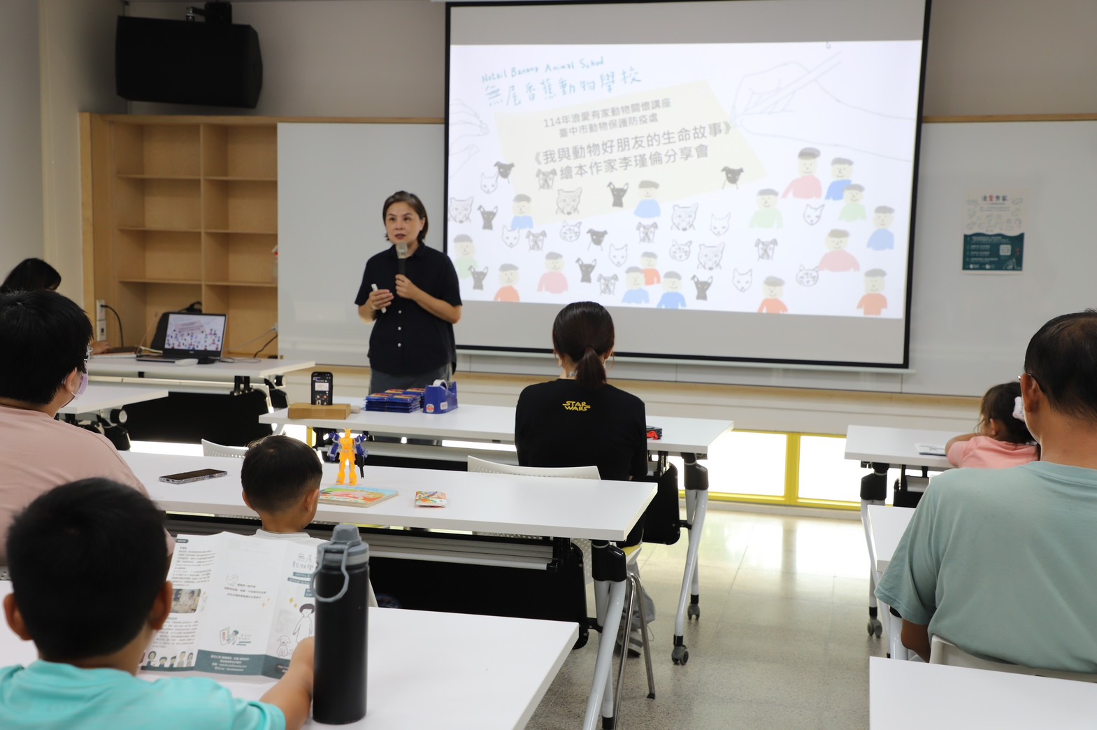 在「幸福毛孩生活課程-培訓犬訓練課程」中,培訓犬協會透過實際示範與互動,引導學員細緻觀察犬隻的尾巴擺動、耳朵位置與身體姿勢,學習解讀情緒與需求。學員們在練習中逐漸掌握與犬隻溝通的技巧,提升與犬隻互動的默契與理解。同時間,浪愛有家關懷動物講座則由繪本作家李瑾倫帶來《我與動物好朋友的生命教育》分享會,透過《動物醫院39號》、《好乖的PAW》、《講貓的壞話》等作品,向大家訴說她與動物朋友相伴的故事。她的畫筆蘊含著細膩的情感,也讓民眾感受到動物陪伴在人生旅程中的溫柔力量。隨後登場的《與動物相愛的練習—貓貓的家人時光故事課》一同走進貓咪的小宇宙,透過繪本朗讀與現場觀察,大家學習如何讀懂貓咪的肢體語言,理解牠們的需求與情緒,在過程中學員還能與動物之家后里園區的園貓一起聽故事,在與牠們的互動中建立連結,學習如何成為貓星人的家人。