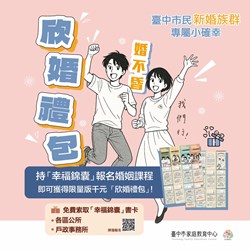 三、欣婚禮包:臺中市新婚市民持「幸福錦囊」共同參加將婚或新婚課程,即有機會獲得限量版「欣婚禮包」,包含臺中知名飯店禮券及其他限量禮品,數量有限!