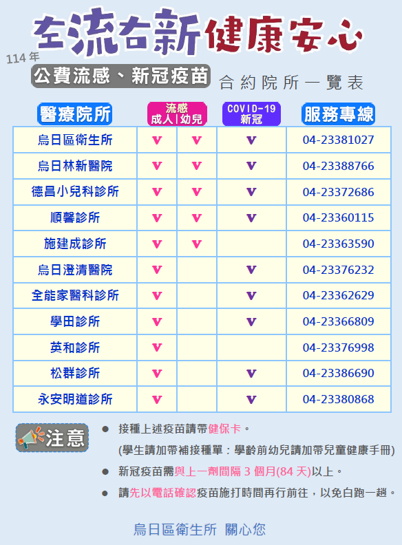 114年烏日區公費流感及新冠疫苗合約院所一覽表。