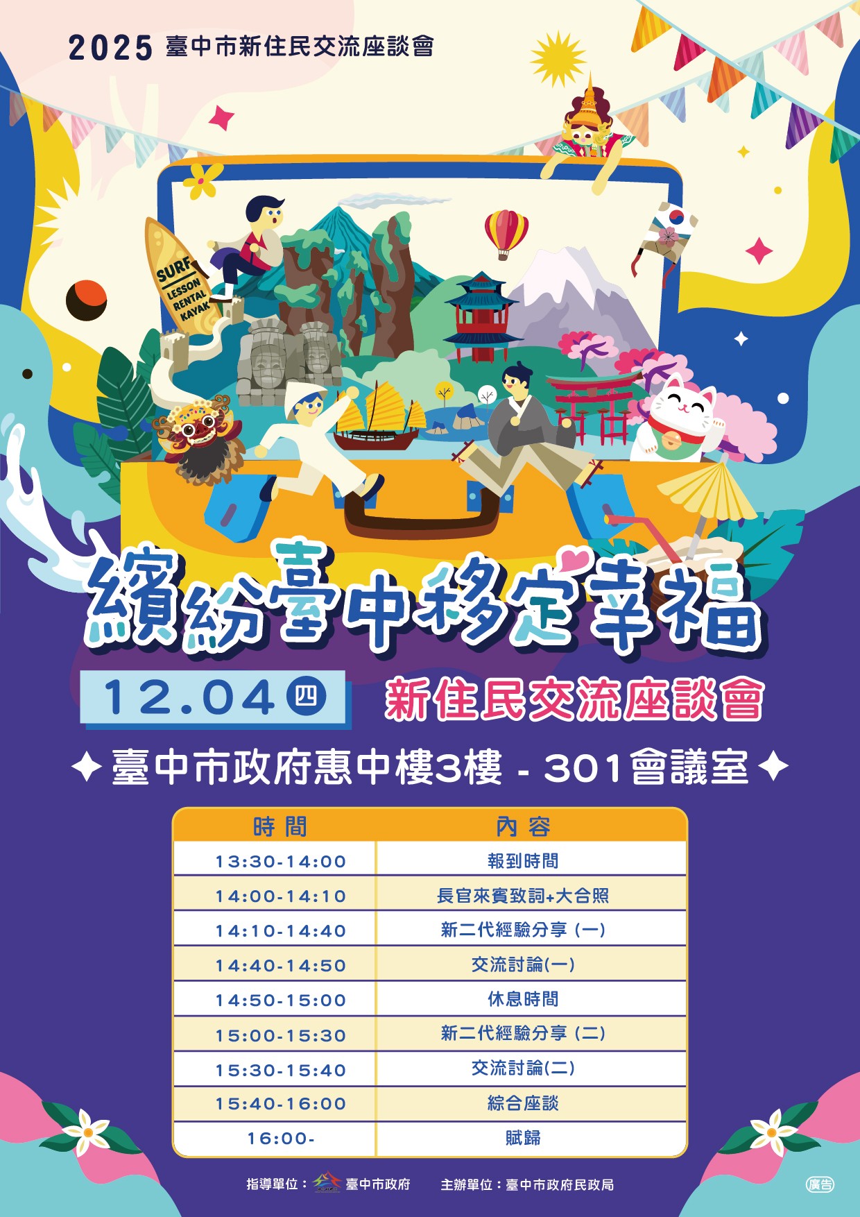 「114 年12月4日(星期四)下午2時至4時,於本府惠中樓3樓301會議室辦理臺中市114年新住民交流座談會,邀請新住民二代代表分享多元文化經驗,歡迎新住民及市民一同參與交流討論。(線上報名網址:https://forms.gle/rxnxfHcdsCiqKTmz5)」