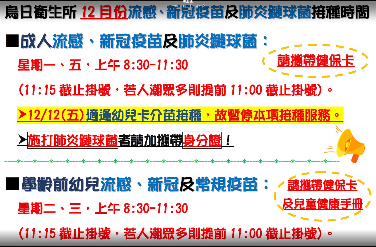 12月12日(五)適逢幼兒卡介苗接種,故暫停流感、新冠疫苗及肺炎鏈球菌接種服務。
