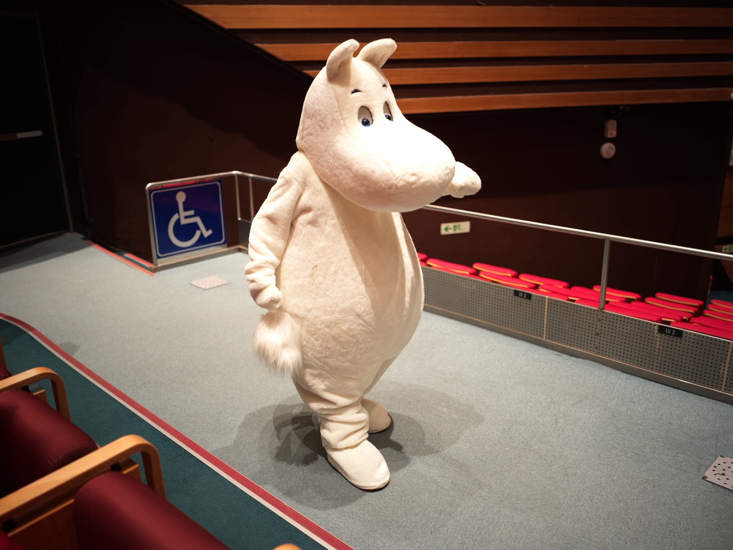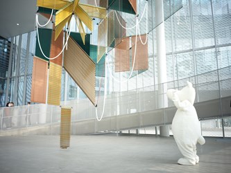 影片《追光之旅:姆明在哪裡》以「線索」作為故事核心,由姆明人偶找尋姆明展區,旅程自台中車站展開,走入熟悉的城市起點,在人來人往之間揭開探索序幕。姆明人偶循著線索前行,來到台中綠美圖,在挑高的美術館大廳空間中,大型藝術作品垂掛其間,一本白色、毛茸茸外觀的書籍悄然現身,成為旅程的第一個提示。線索隨後延伸至兒童閱覽室外,相同的書籍再次出現,透過孩子筆下的塗鴉,串起閱讀、想像與城市記憶。