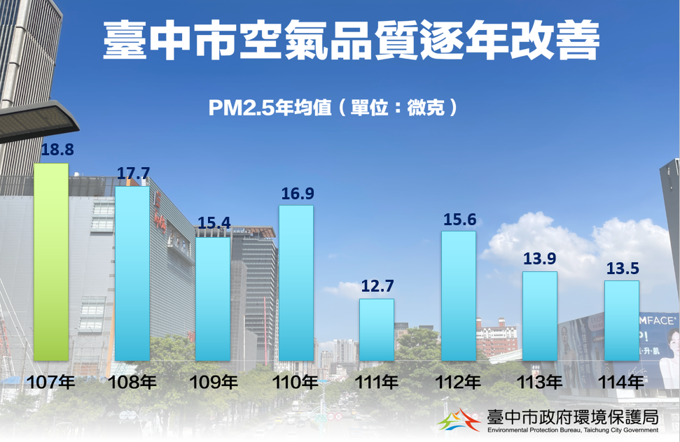 在各項政策與科技治理並進下,台中市PM2.5從107年的18.8微克,改善到114年(統計至11月)的13.5微克,改善幅度接近3成。展現治理方向與具體成果,市府也將持續朝國家空氣品質標準12微克目標邁進,為市民打造更健康宜居的城市。