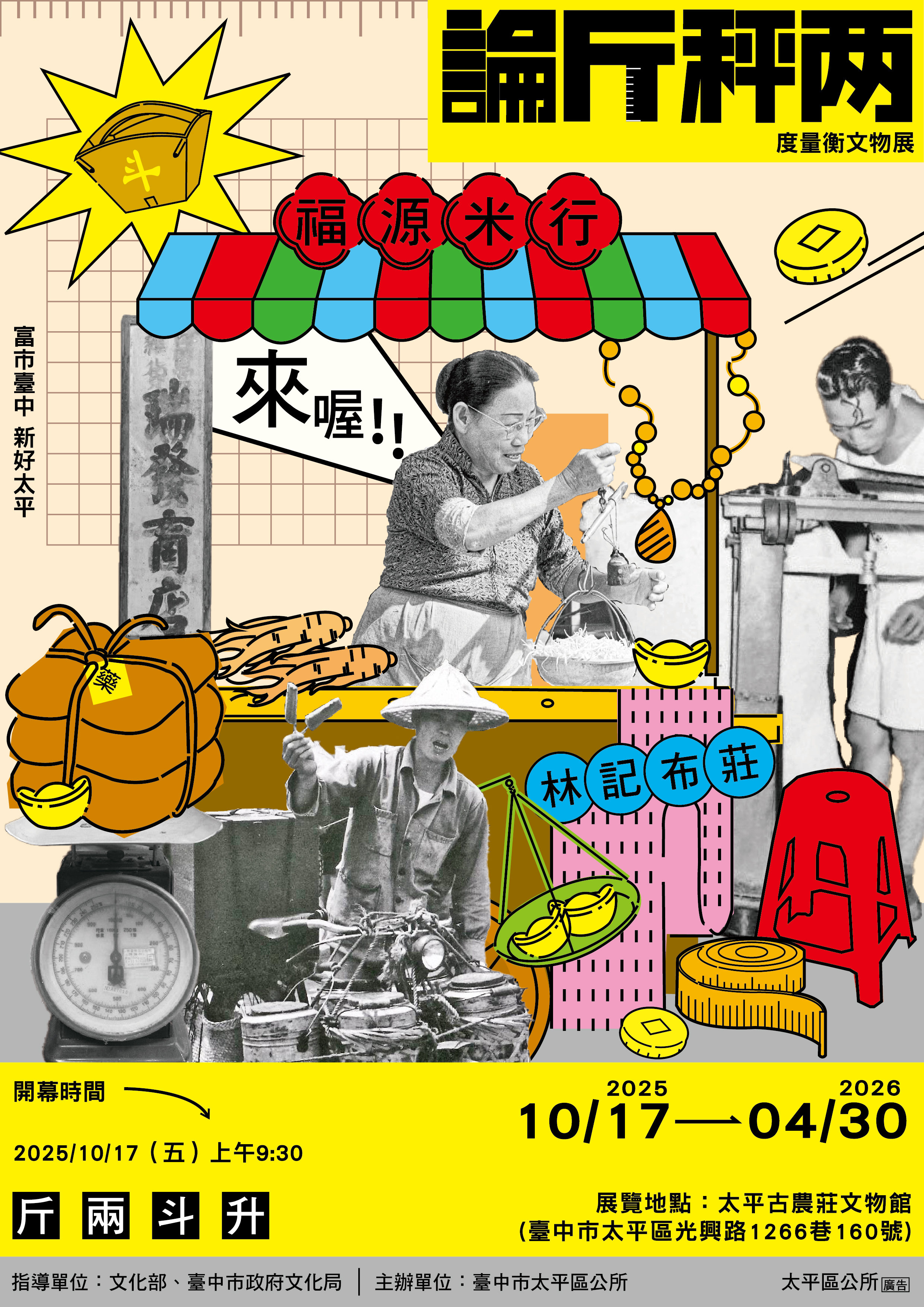 現代人準備年菜時,已有各色各樣的現成菜餚能選擇、預訂,洗手作羹湯的機會比起過去少了許多,但過年期間免不了還是要論斤秤兩─無論是秤菜,還是秤自己的體重。太平古農莊文物館在這段期間,推出了「論斤秤兩」展覽,讓觀眾親自體驗「一桿秤仔」如何量測蔬菜重量、量體裁衣應該怎麼使用布尺。而站上巨大的「磅秤」則是最受大小朋友歡迎的體驗。快點呼朋引伴來看看彼此幾兩重吧!