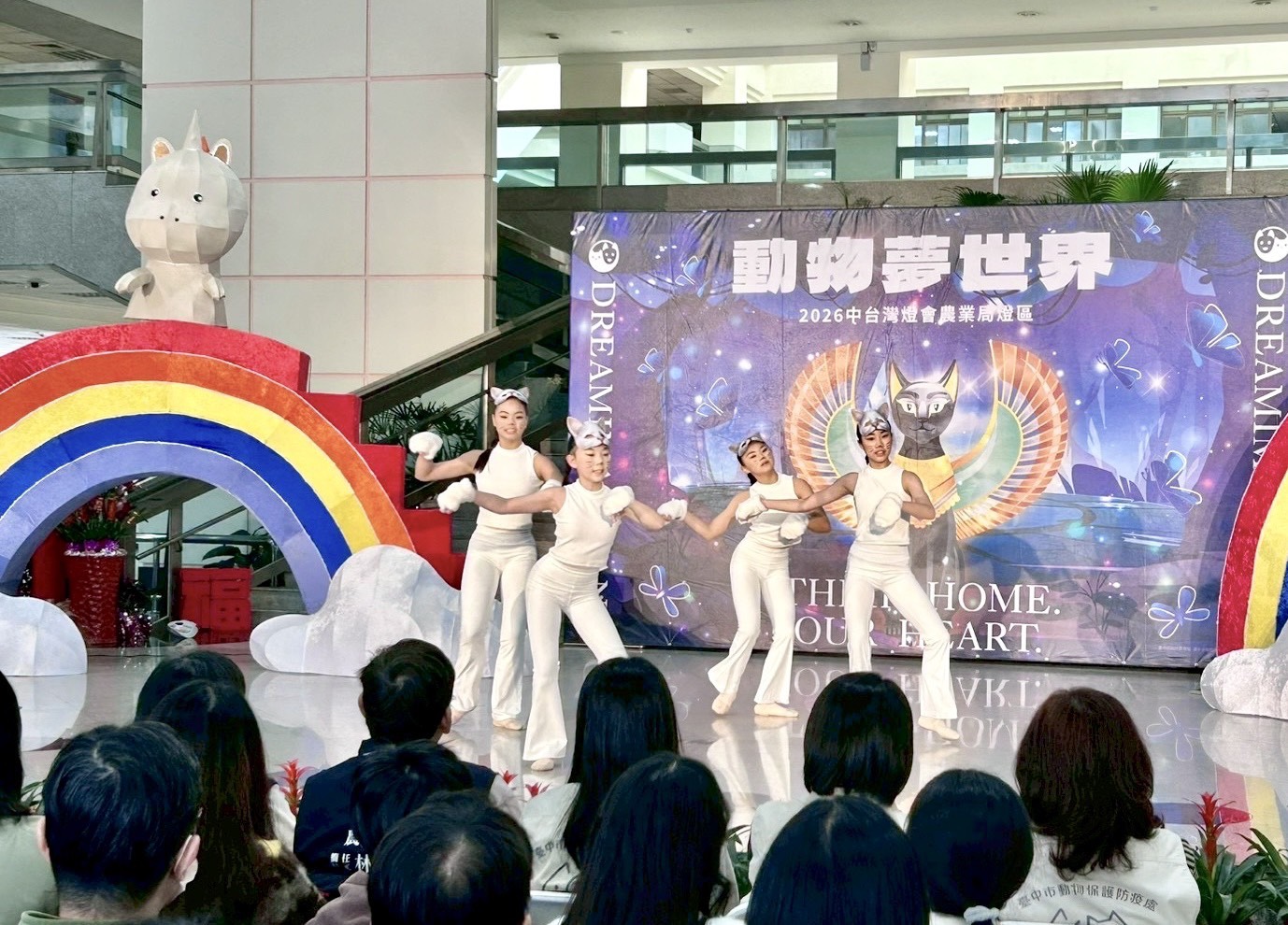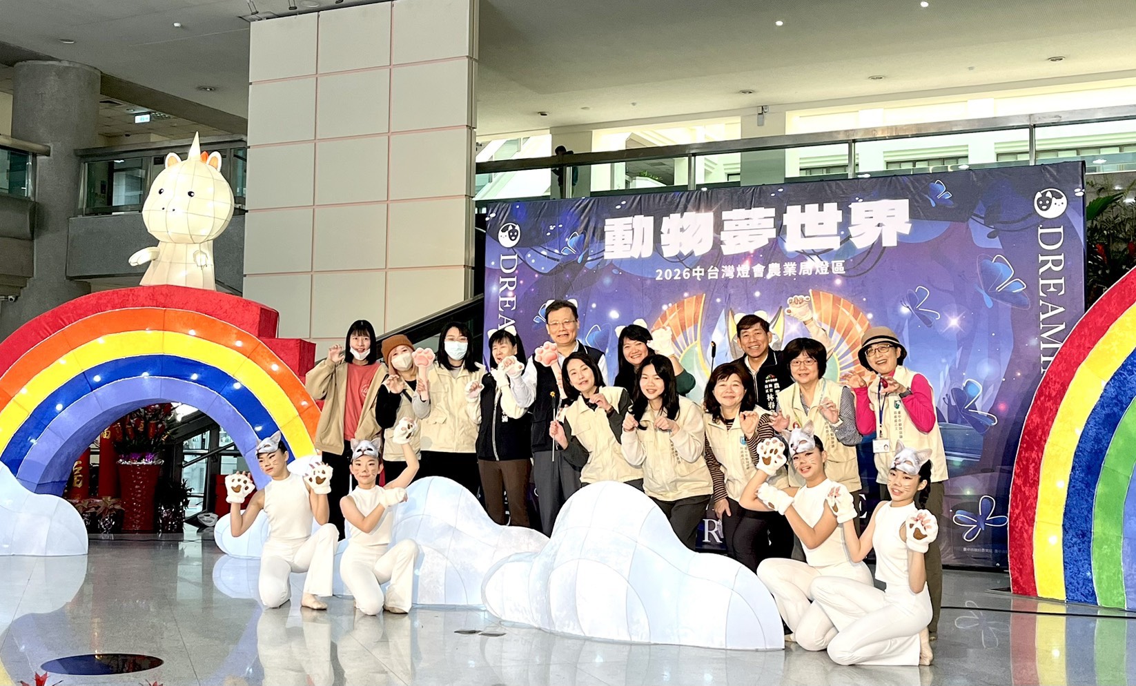 本次記者會特別安排吸睛開場表演,由臺中市如玲舞蹈表演藝術教育學院帶來「小白貓主題創意舞蹈」,以活潑童趣的舞步揭開「動物夢世界」奇幻序幕,呼應燈區以小白貓「喵喵」為主角的設定,讓現場觀眾們感受燈區的活潑童趣的氛圍與故事魅力。「動物夢世界」燈區邀請民眾跟隨主角「喵喵」踏入從神秘通道,在夢境裡逐步認識野生動物面臨的生存危機、飼養寵物的飼主責任等,在旅途中看見人與動物和諧共處的美好,提升民眾對動物福利的認知。
