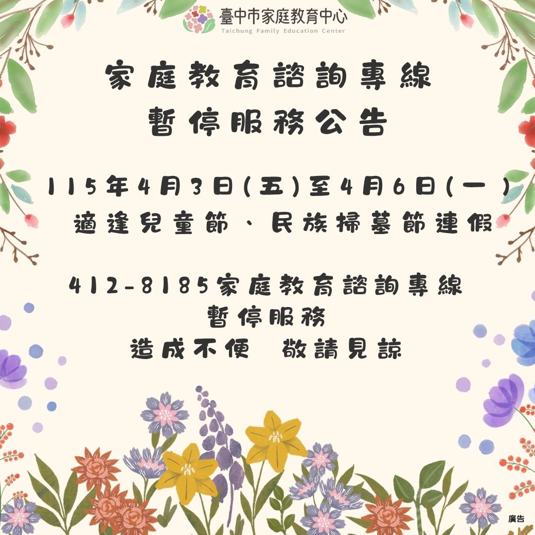 115年4月3日(五)至4月6日(一),適逢兒童節、民族掃墓節連假,412-8185家庭教育諮詢專線暫停服務。