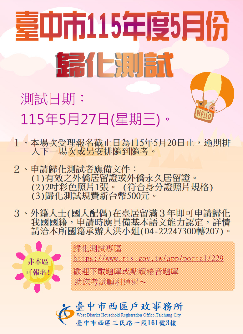 臺中市115年度5月份歸化測試開始報名~(臺中市西區戶政事務所)