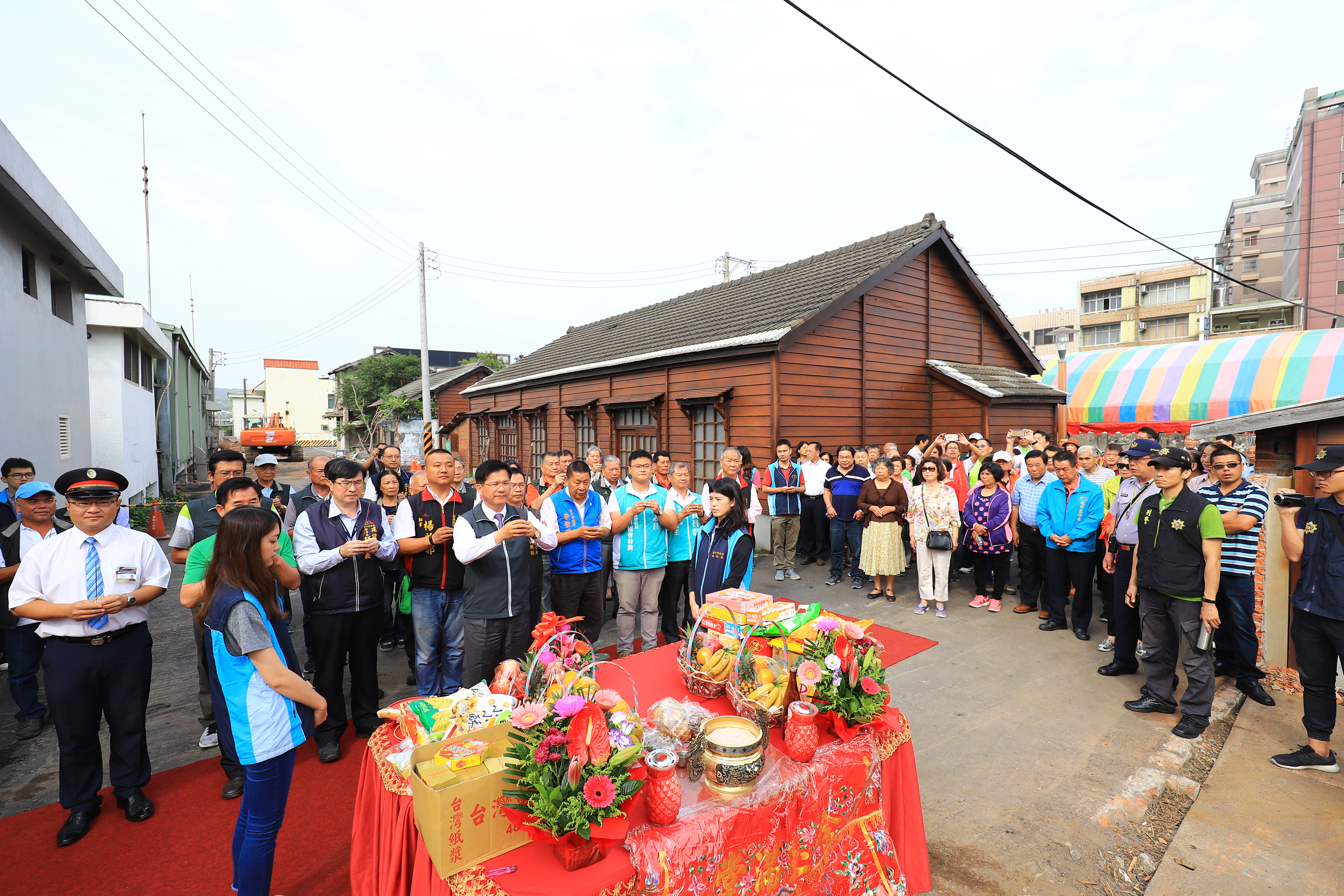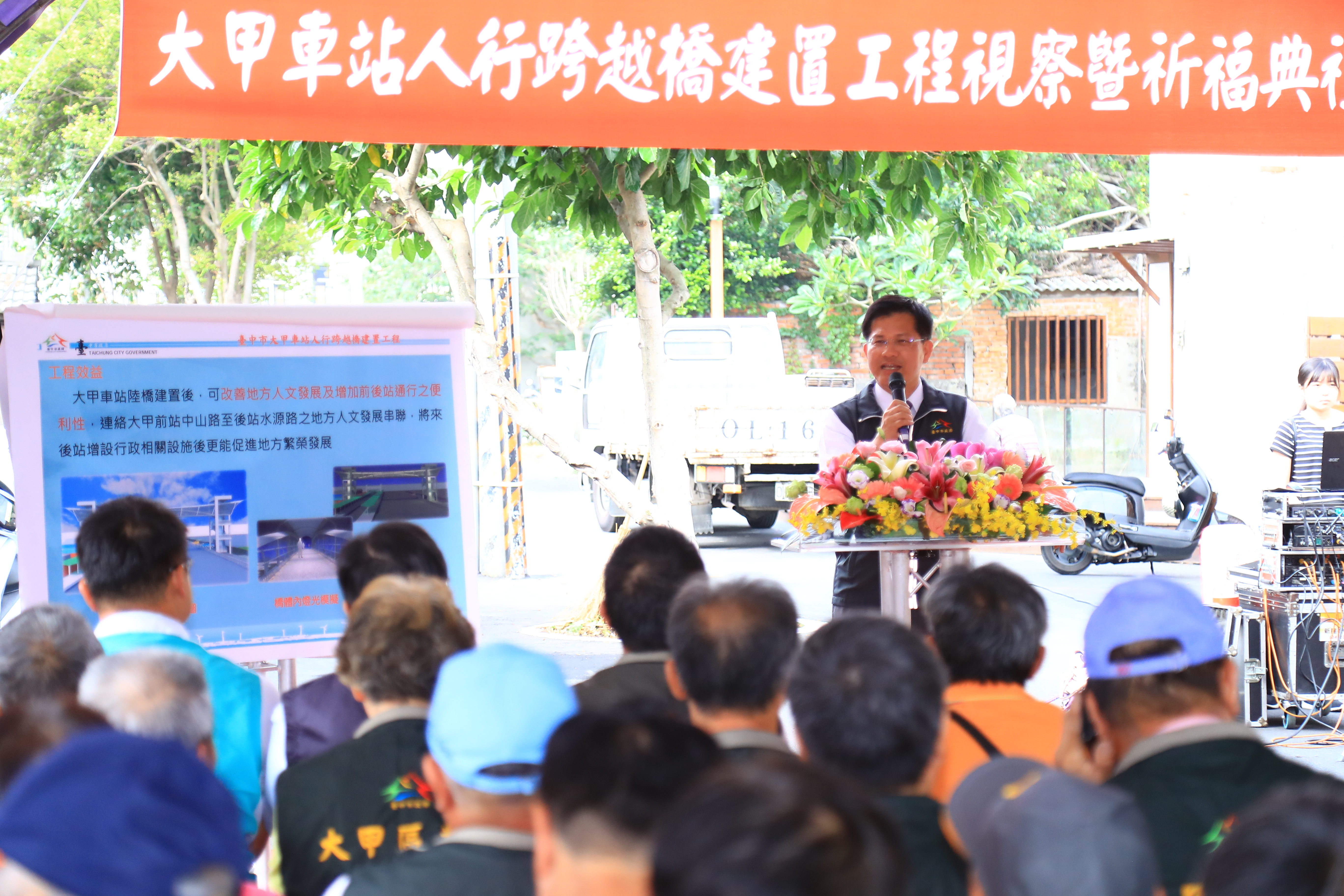 今日的開工祈福典禮在大甲火車站旁舉行,包括市議員吳敏濟、李榮鴻等人都出席,建設局副局長顏煥義、大甲區長劉來旺、外埔區長陳柏宏、大甲火車站站長李兆平、火車站所在地的大甲里長黃勝裕也與多位里長,一起出席典禮祈求工程平安。