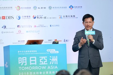 首屆「明日亞洲」亞太社會企業高峰會,今(5)日起在台中文化創意產業園區舉辦為期兩天的活動,以「銀髮」、「食農」、「環保綠能」及「弱勢就業」為主題,邀請國際各領域專家擔任演講者,結合論壇、市集等方式進行交流,陳建仁副總統、台中市長林佳龍也出席會議。陳副總統表示,此次高峰會對台灣來說是社企發展的重要里程碑,希望透過彼此交流分享,為亞太國家帶來更好的明日社會。林市長說,十分榮幸高峰會選擇在台中舉辦,相信將有助於打造台中成為社會創新實驗的重鎮。