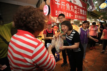 今天的愛心日活動限量1000斤,每人限購2斤,排隊人龍一早已繞行市場,市長夫人廖婉如代表市府頒發感謝狀給丸東商號,感謝多年來對社會弱勢的照顧與奉獻;本次活動所得將捐助給台中市身心障礙福利機構「十方啟能中心」,機構為表示感謝,也出動7名成員熱情叫賣,市議員江肇國、立委黃國書服務團隊也到場共襄盛舉,場面熱鬧溫馨。(5/7*20)*社會局