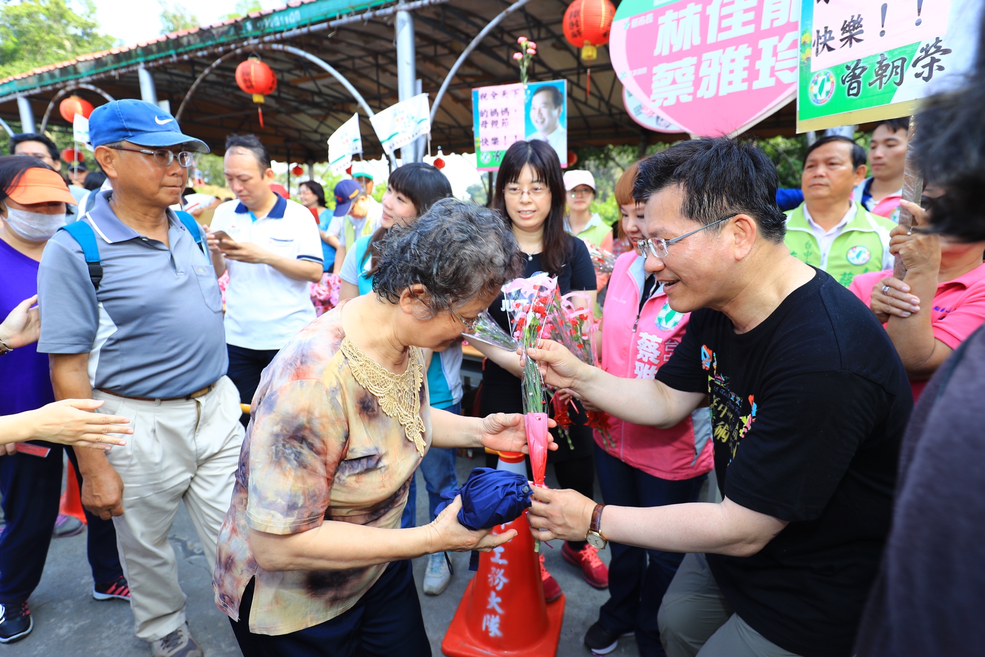 林市長每年皆會在母親節前夕到大坑觀音亭發送康乃馨,感謝天下媽媽對家庭的付出,今日一早他到觀音亭逐一發送康乃馨,親切與民眾問候合照,民眾反應熱烈。包括議員曾朝榮、蔡雅玲、張耀中皆一同共襄盛舉。