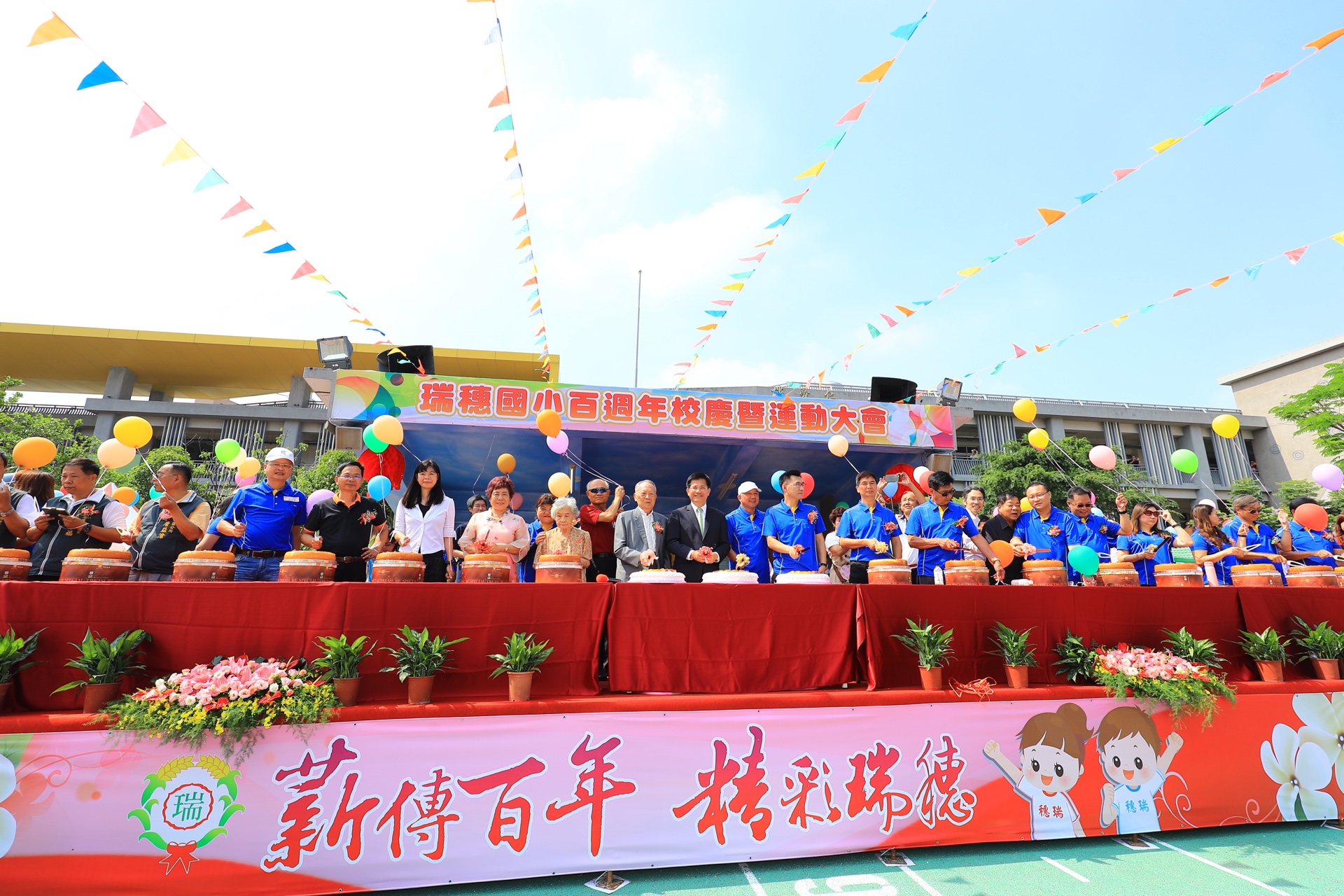慶祝瑞穗學校創校100歲生日,學校師生準備100顆生日蛋糕,並施放彩虹氣球,氣氛熱鬧。立委江啟臣、議員陳本添等人也到場祝賀。