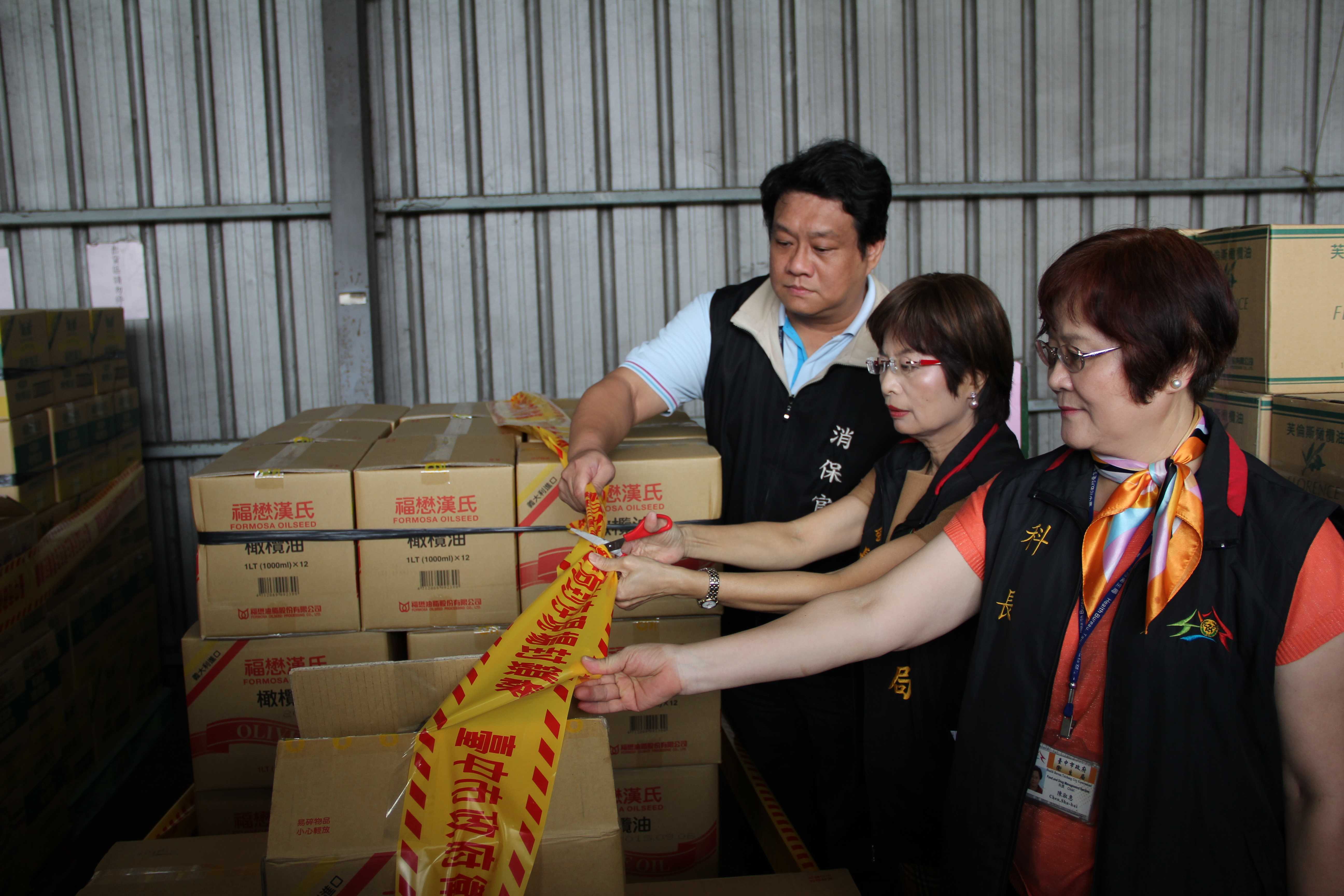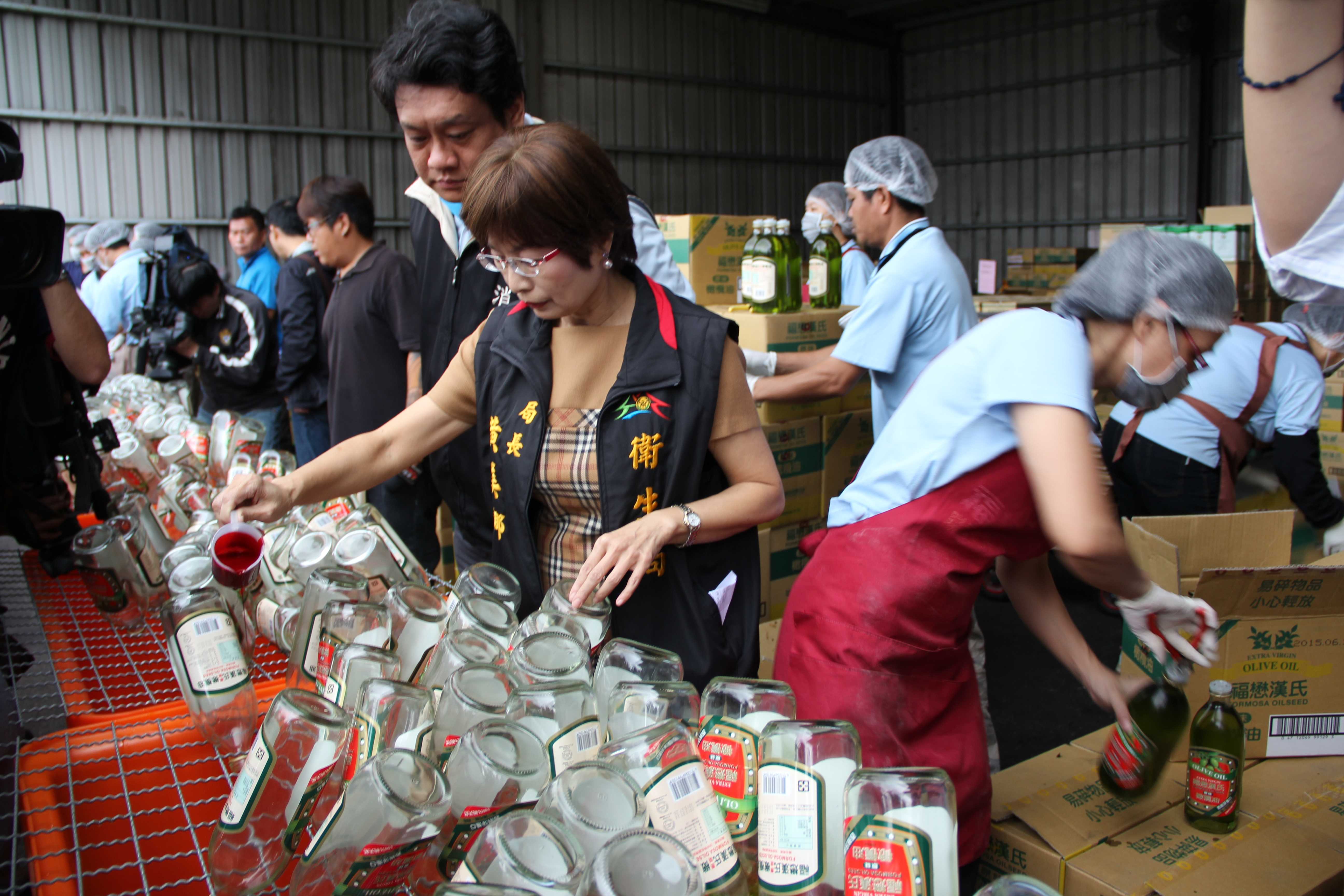 大肚區油脂業者有6款油品被驗出摻偽不實,臺中市政府衛生局長黃美娜及法制局消保官陳柏菁今(6)日上午前往開封、回收;連日來業者已出動20臺卡車,前往下游廠商進行回收,共回收28131瓶,合計41公噸,將載到南部回收提煉為工業用生質柴油。