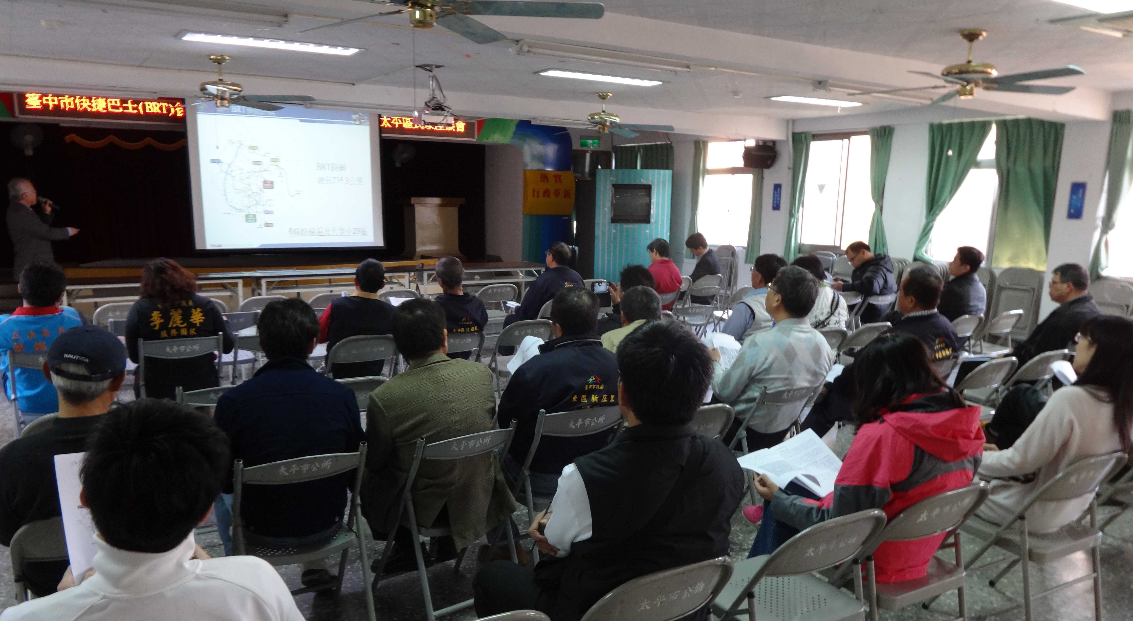 臺中市政府交通局今(29)日下午於太平區公所,舉行快捷巴士BRT藍線東延段(東區、太平區)民眾座談會,會中就藍線主線往東延伸段路線、路型配置及車站型式、各車站位址等議題規劃方案提出說明,並聽取地方意見,出席民眾對於未來BRT到太平的路線及現有道路路寬能否有空間設置BRT專用道等表示關切,希望交通局能做好相闗規劃。
