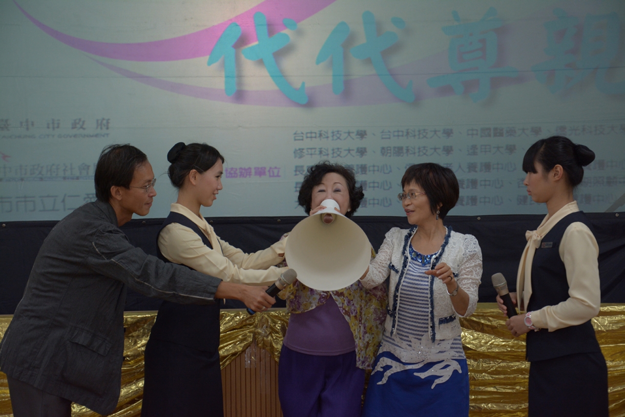 一年一度「臺中市大人日系列活動-代代尊親」今(26)日市立仁愛之家登場,市長夫人邵曉鈴出席與50位長輩同樂,並主持敘述同學至老人福利機構提供服務的微電影首播及第三部微電影開拍儀式,靜宜大學50位師生也出席與老年人們按摩互動,聊天,現場溫馨感人。