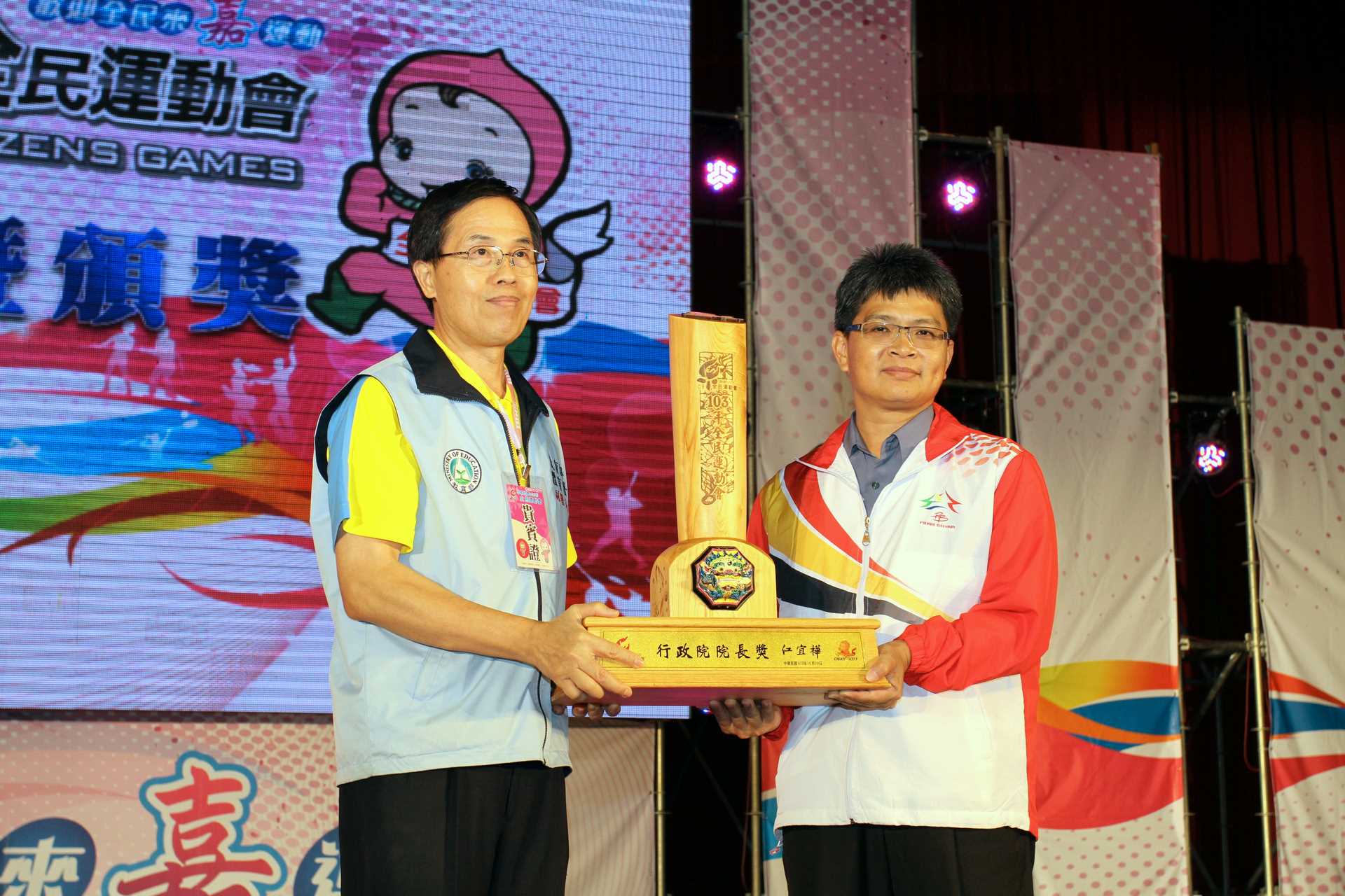 103年全民運動會經過五天激烈的競技於今(29)日落幕,臺中市代表隊共獲42金、26銀、27銅,金牌數排名全國第一,表現優異,獲頒行政院院長獎,由臺中市體育處長房瑞文代表受獎,帶回屬於臺中市的榮耀。體育處表示,臺中市代表隊表現十分優異,在女子組健力、男子組拔河、女子組水上救生、男子組沙灘手球、女子組太極拳、混合組元極舞、男子組槌球、女子組槌球等項目獲得績優總類錦標獎的第一名,表現十分亮眼。(10/29*3) 聯絡人:市府教育局謝小姐 聯絡電話:04-2289111分機54021