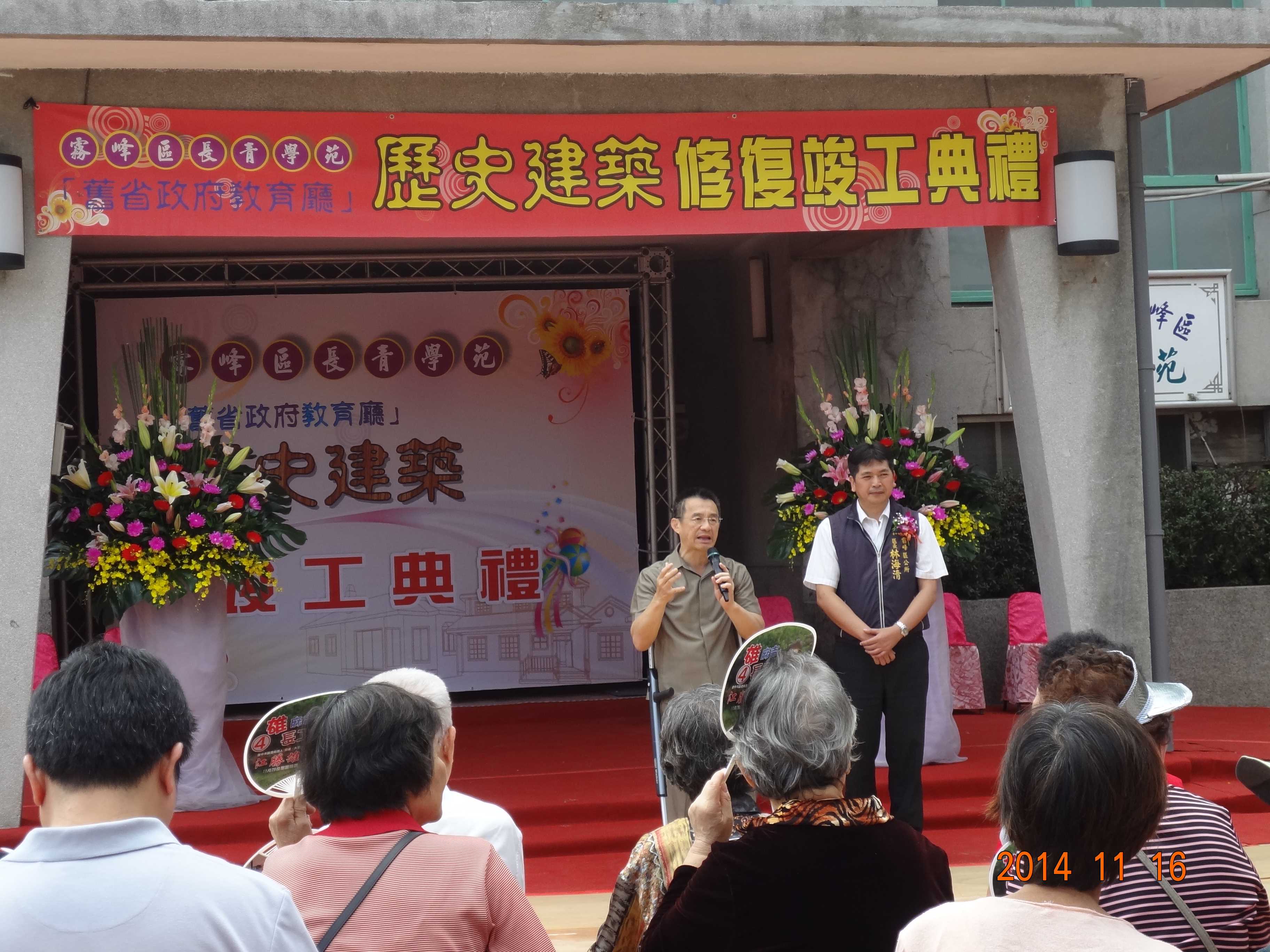 今(16)日陽光高照,帶著微微涼風,是個舒服的好日子,霧峰區公所今天舉行修繕工程的完工典禮,地方民眾都踴躍參加,副市長徐中雄、市議員江勝雄、霧峰區區長林海清也到場共襄盛舉。