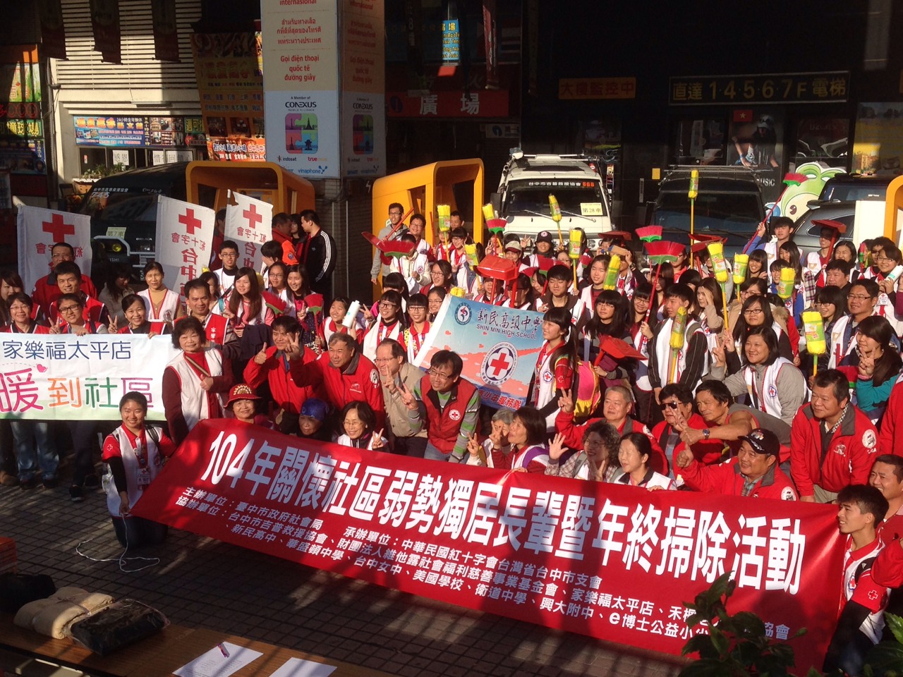 市府社會局表示,紅十字會臺灣省臺中市支會於97年起持續在農曆春節前夕為臺中市社區弱勢獨居長者做年終掃除,至今已邁入第八年,今年報名參加服務志學生高達100多位,包含新民高中、興大附中、華盛頓中學、美國學校、衛道中學、臺中女中等,為臺中市約60戶長輩年終掃除。