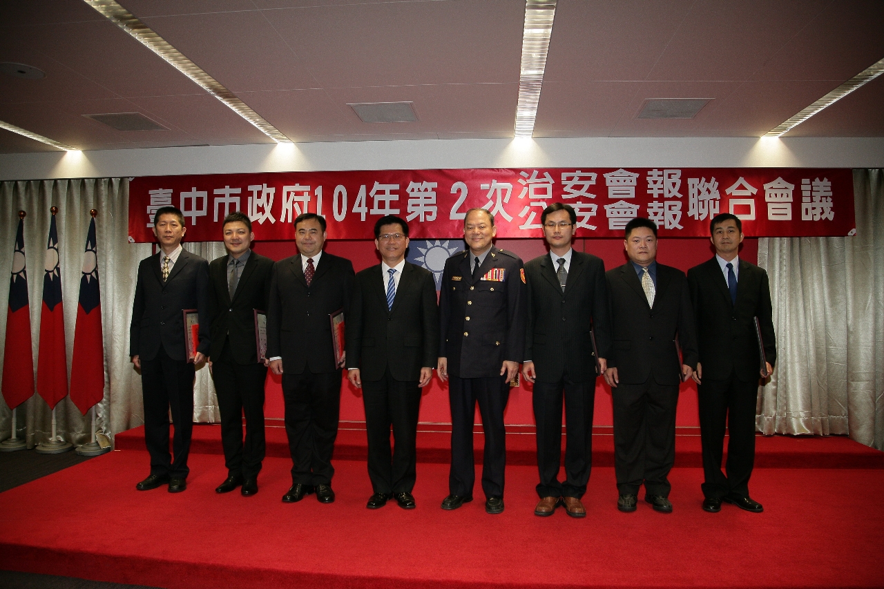 今日會中林市長頒發103年下半年警政署全國「掃黑」工作評列「特優」、六都第1名獎項給市府警察局,肯定臺中的掃黑成效;會中播放警察局今年拍攝的微電影「春安啟動、幸福臺中」,他也盛讚展現了警察專業形象。