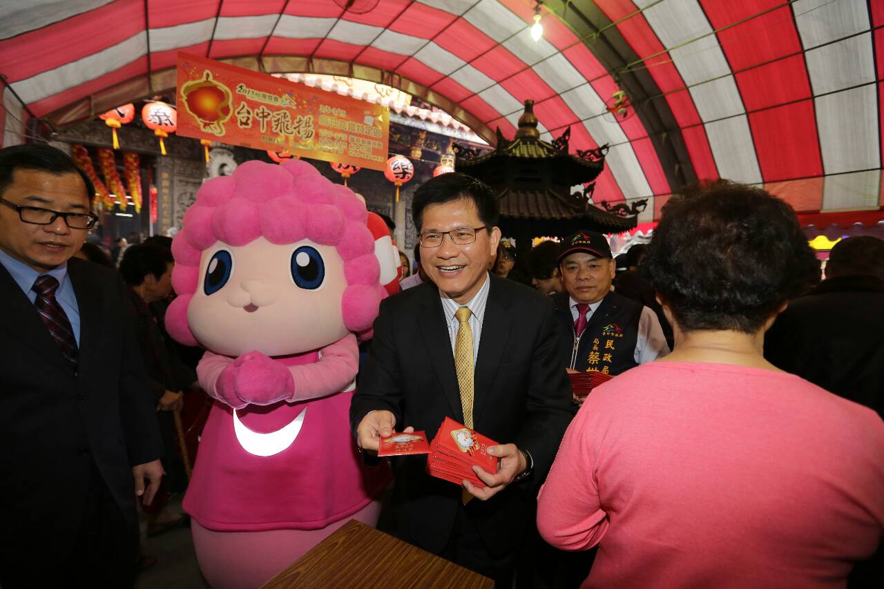 林市長首站前往樂成宮參香,向媽祖獻上祝品,為民眾與臺中祈福,隨即發放羊年紅包給現場民眾;民政局長蔡世寅、東區區長楊清泉、市議員何敏誠、鄭功進、立法委員黃國書等人也共襄盛舉。