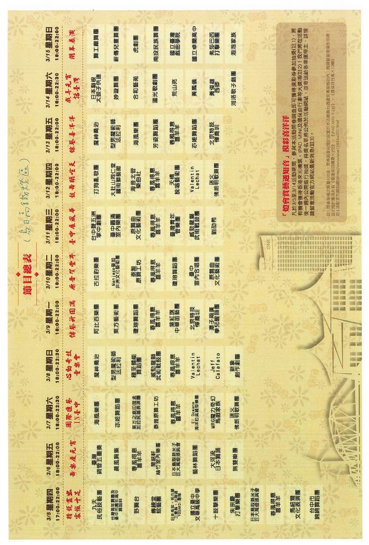 2月28日臺中公園燈區的「吉羊康泰」主燈將再現12年前的風華,更精心搭設日月湖水上舞臺,在百年古蹟湖心亭的映襯下,邀請超過80%在地優良的表演團隊,包含九天民俗技藝團,瓊瑢舞蹈團、台中室內合唱團,以及鐵獅玉玲瓏、無雙樂團等,給您連續六天璀璨豐富的藝文夜晚。