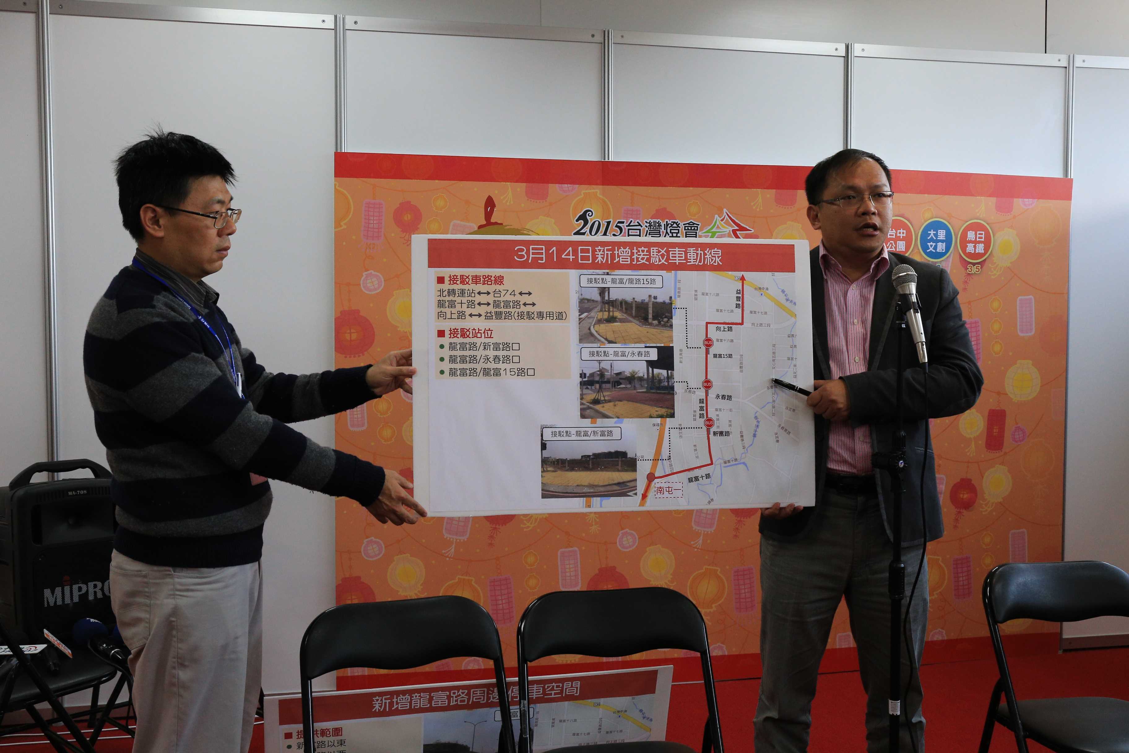 王局長宣布,自行開車的民眾,除原規劃的P1至P5停車場外,本周末將再增加老虎城旁邊及第二單位重劃區(新富路以東、益豐路以西、向上路以南及龍富路以北)路邊,各可提供1,500格停車位。並在龍富路上設立3處接駁車站點,自上午10時至夜間24時止,民眾可停車後搭乘免費接駁車進入燈區,預期可紓解P4停車場(五權西路二段與向上路三段口)的車潮。