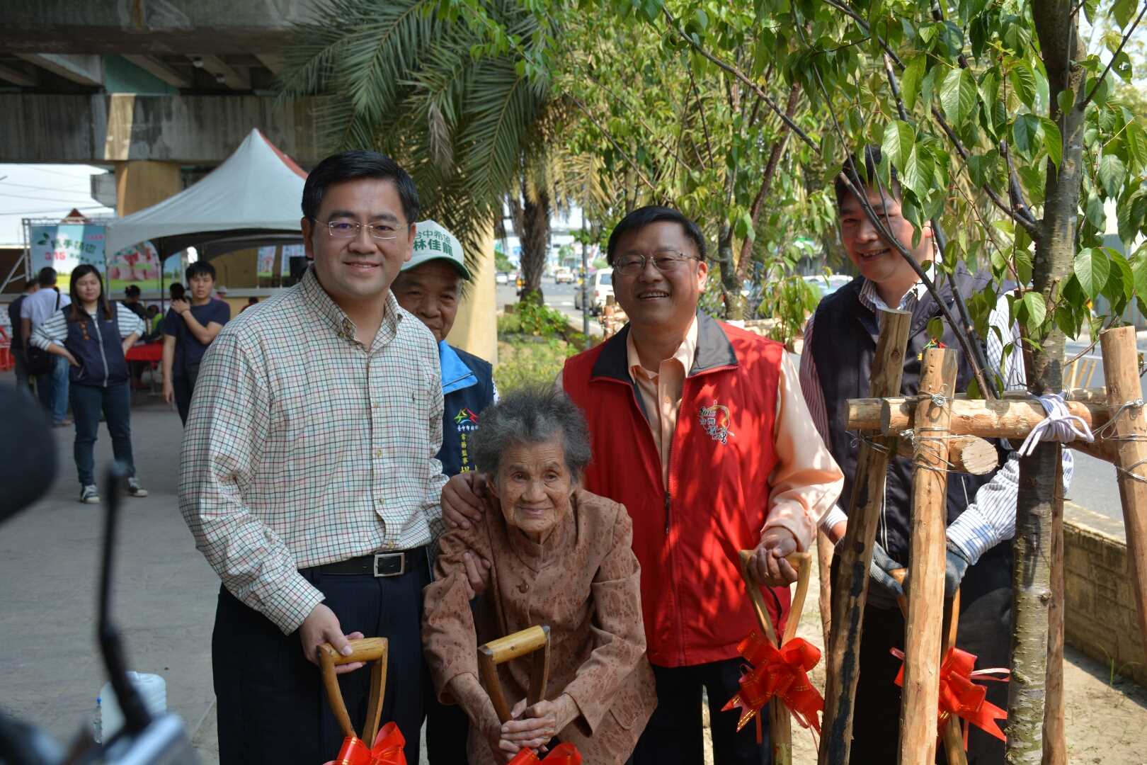 市府農業局長王俊雄、市議員張滄沂、霧峰區長林海清等人都到場加入種樹行列,王局長邀請民眾「一人一樹、種下希望的種子」,希望重新將大臺中打造成綠樹與人文交織的美麗城市。活動也邀請地方百歲人瑞來參加,場面溫馨熱鬧。