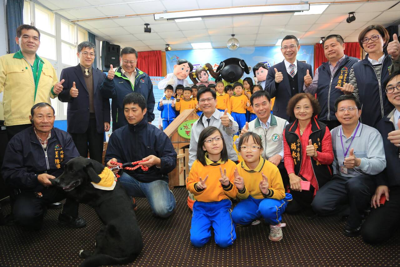 林市長肯定水美國小認養照顧校犬「小黑」長達八年之久,他說,小黑是幸福的毛小孩,因為在這裡有一群愛牠的家人,但在臺中市動物之家,還有很多沒有家的毛小孩,等待人們伸出手,給予一個溫暖的家,呼籲孩子回家後轉達家長,用行動支持動物認養。