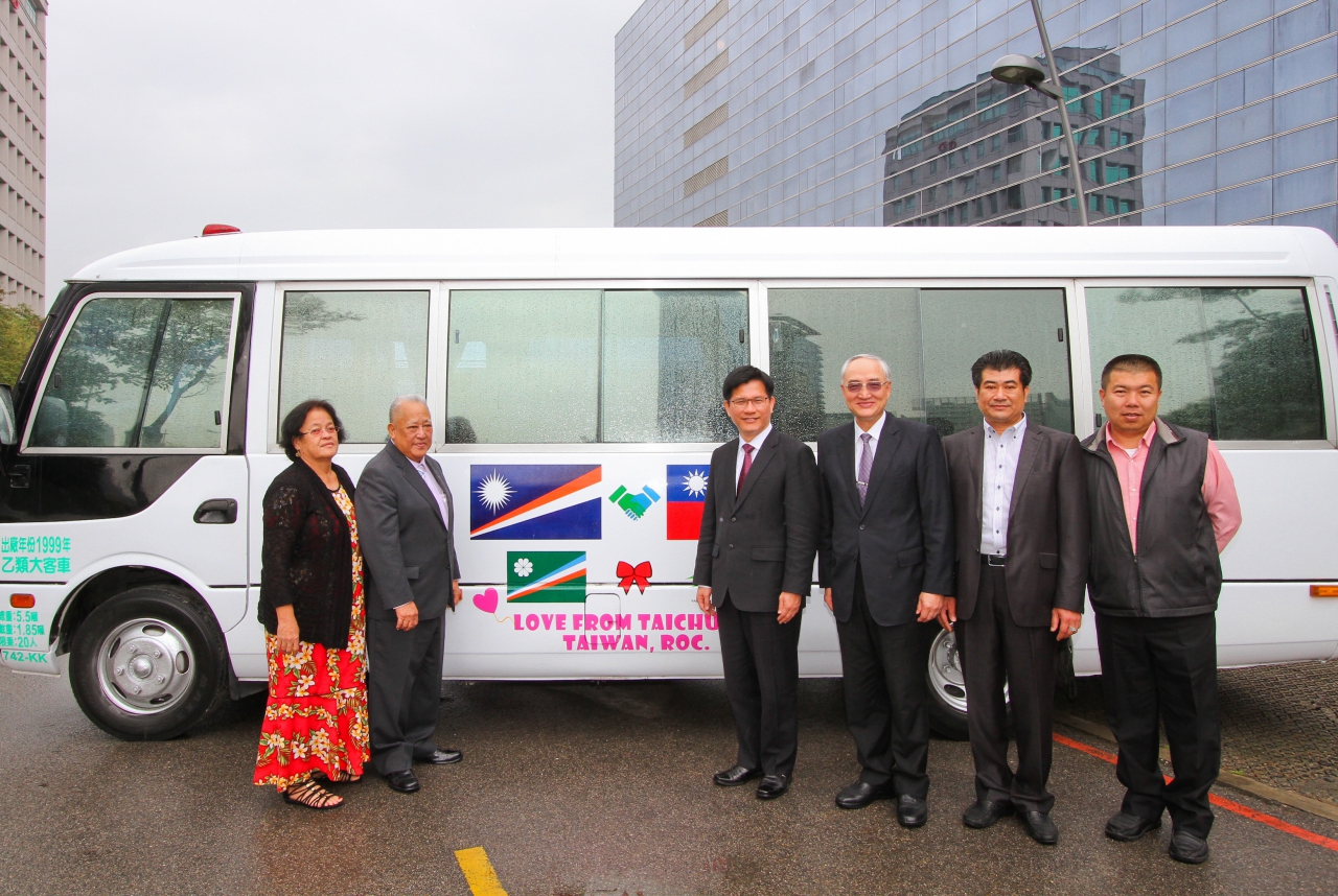 致贈儀式今日在市府臺灣大道市政大樓舉行,林市長與共同出資的在地企業新亞裕旅行社總經理張鼎盛、蓬進營造有限公司董事長柯義祥共同致贈,馬國駐華特命全權大使卡布亞(Phillip K. Kabua)代表受贈,外交部中部辦事處處長黃榮國、市府秘書處長李如芳、觀光旅遊局長陳盛山也出席見證,場面隆重。