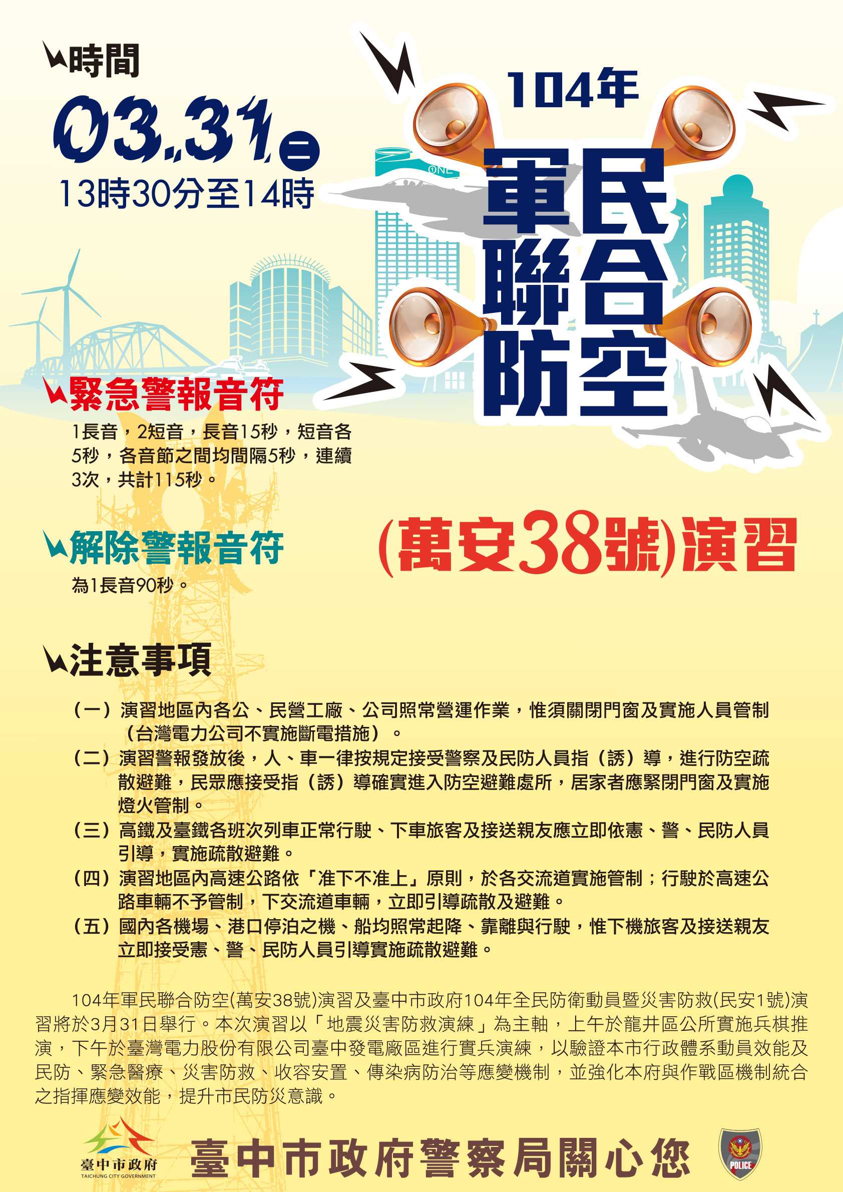 此外,警察局當天下午1時30分至2時舉行萬安38號演習,將實施30分鐘防情傳遞、警報發放、人車疏散、交通管制及戰災救護等演練,人、車一律按規定接受警察及民防人員指導,進行防空疏散避難,居家者應緊閉門窗及實施燈火管制。