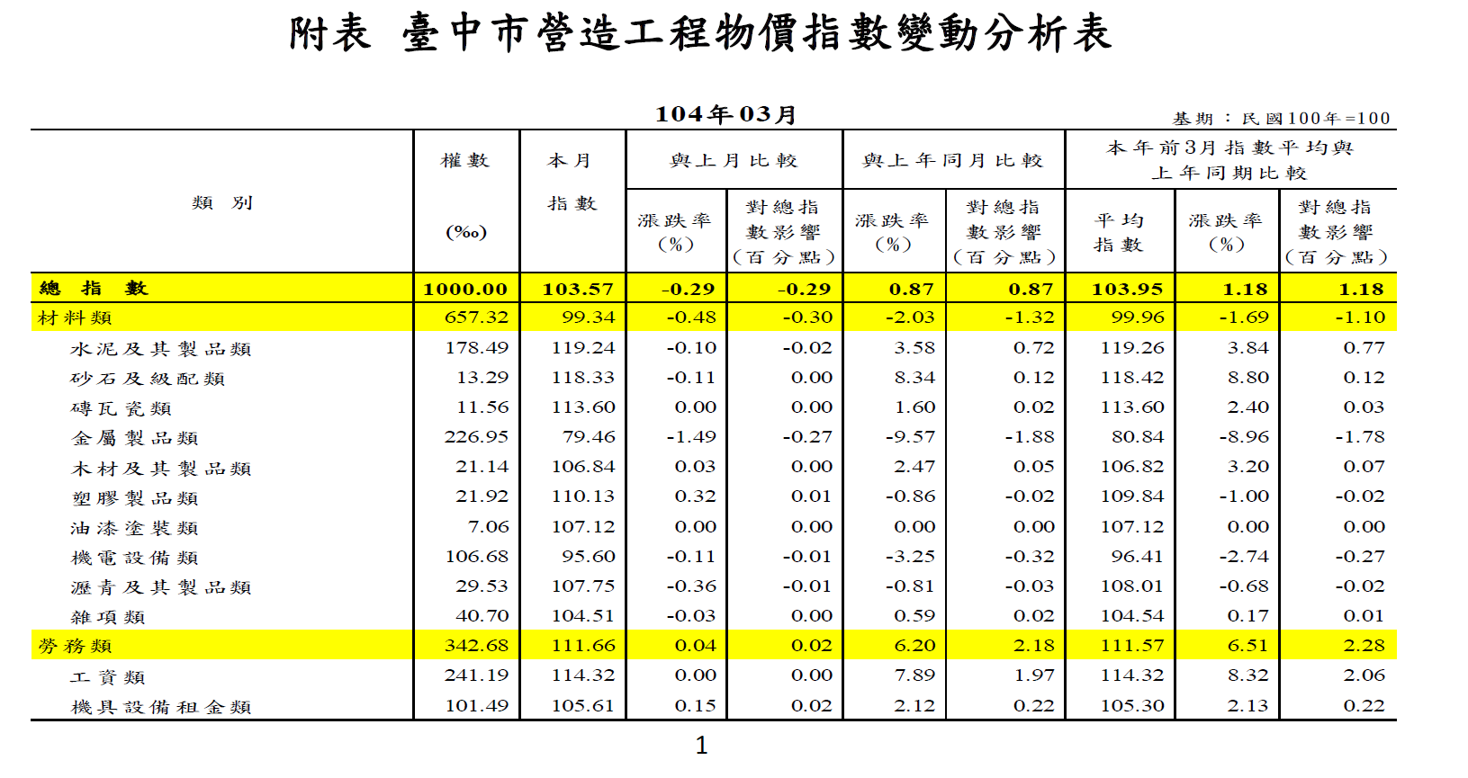 今年3月較上月下跌0.29%,因金屬製品類受鋼筋價跌影響,指數下跌1.49%導致材料類指數下跌0.48%;因機具設備租金類上漲0.15%,勞務類指數上漲0.04%。