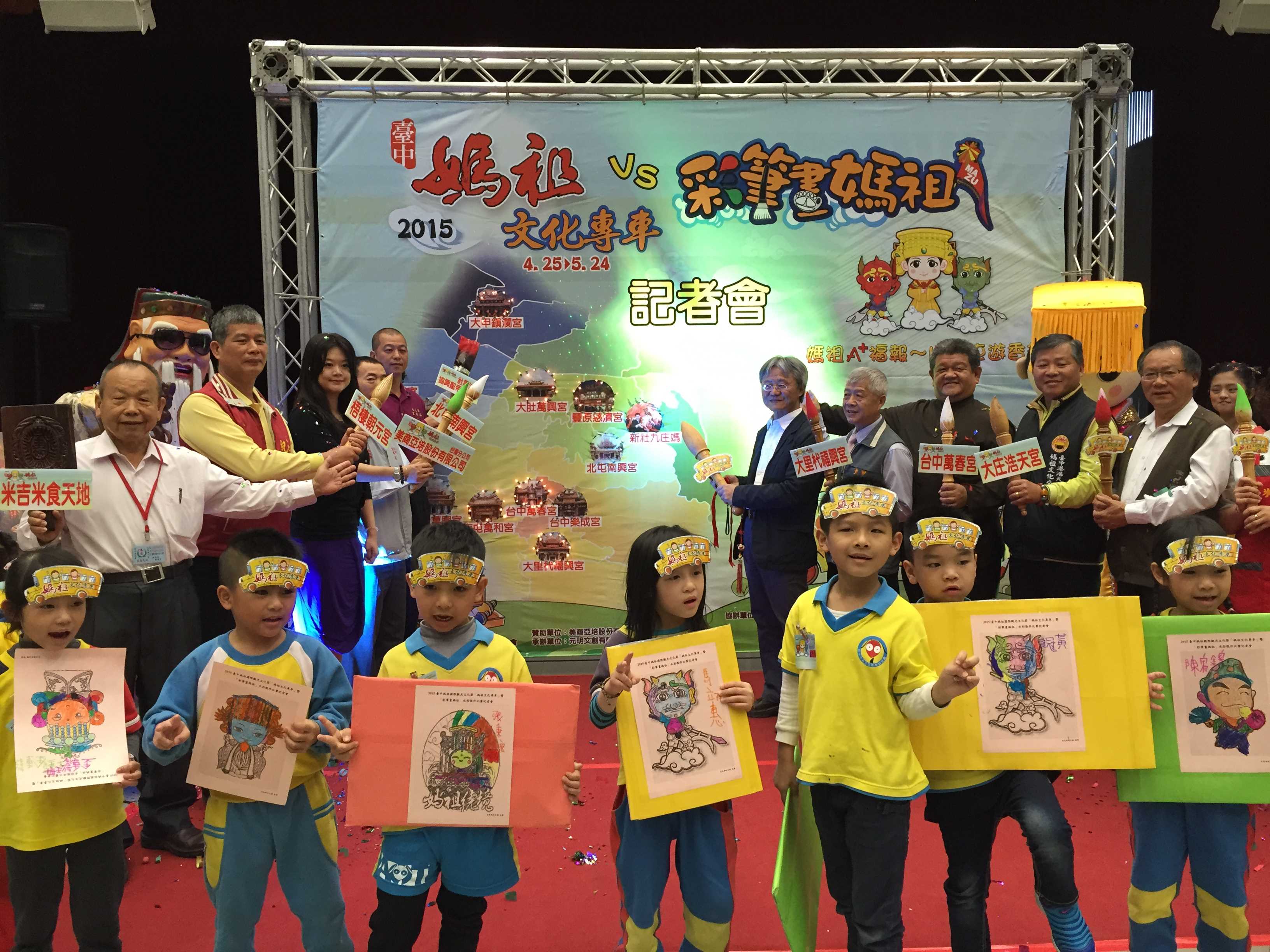 市府文化局今(10)日於新市政大樓舉辦「媽祖文化專車及彩筆畫媽祖水彩徵件比賽」啟動記者會,文化局長王志誠與多位臺中市媽祖宮廟代表一同進行啟動儀式,象徵媽祖系列活動開跑,並邀請廣靈民俗技藝團帶來媽祖神童藝陣表演,為活動揭開序幕。