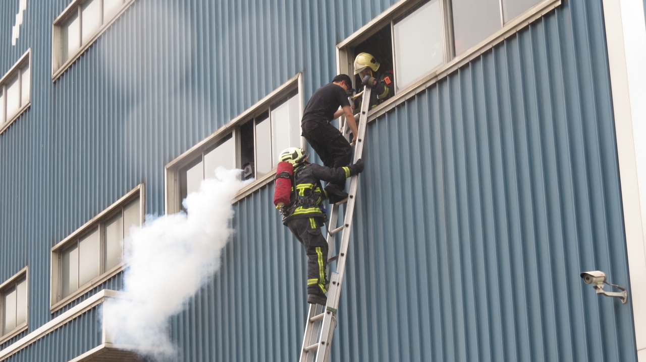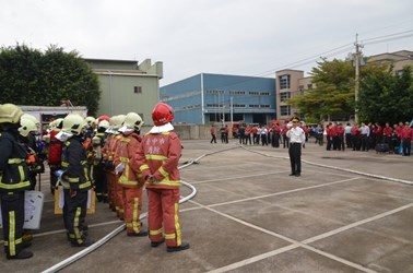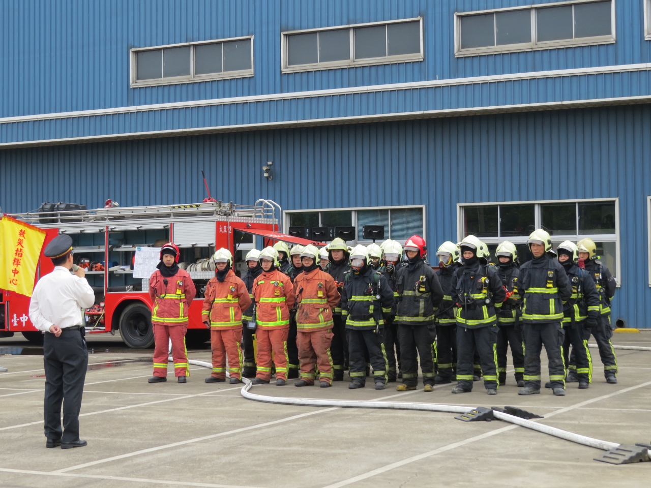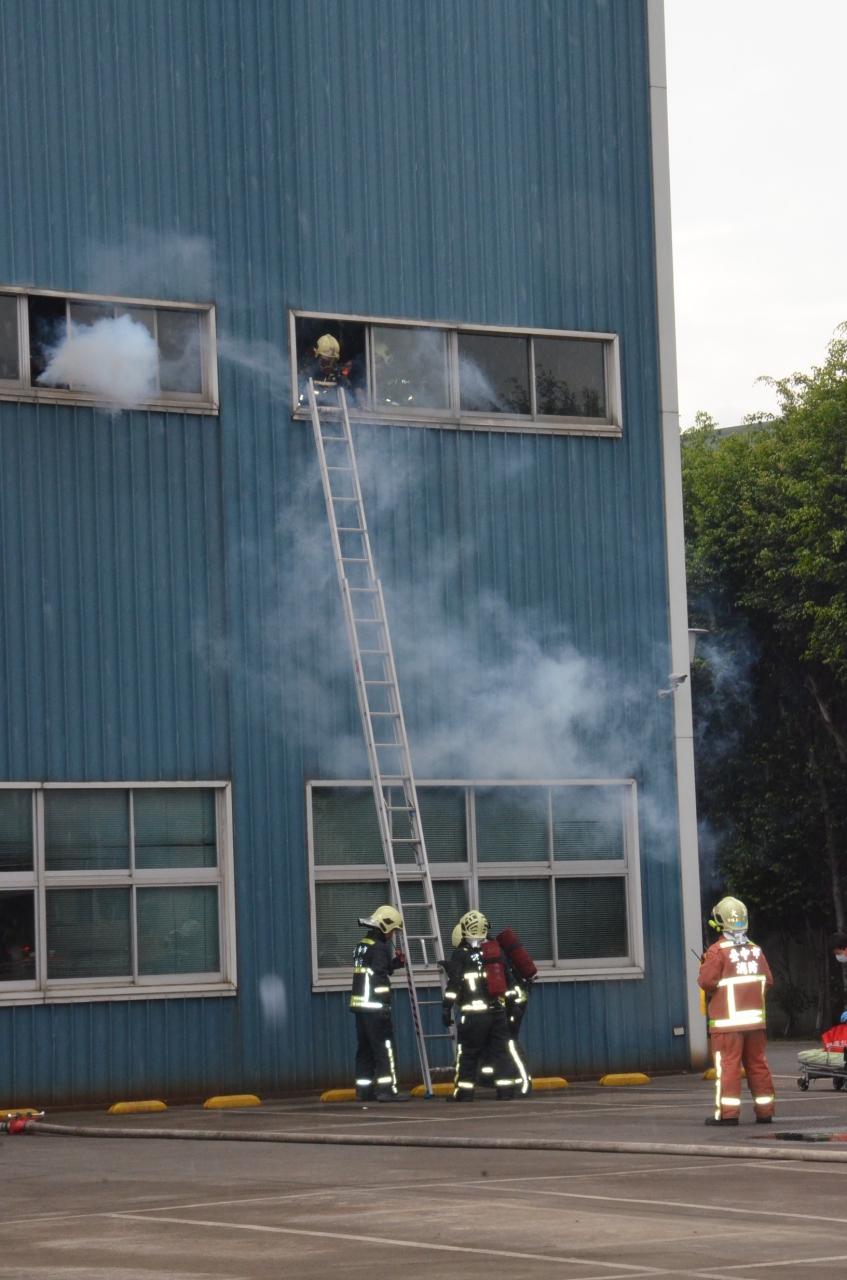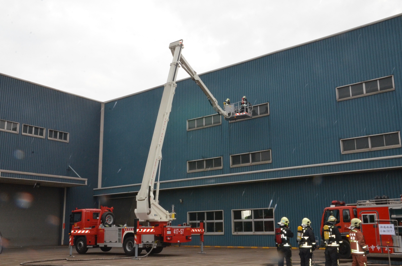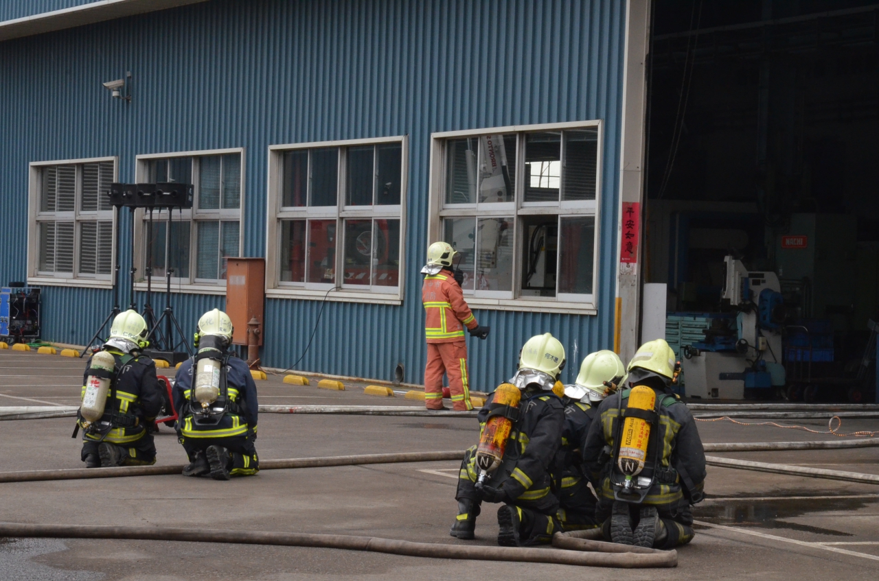 消防局3月12日曾前往南投縣竹山鎮內政部消防署訓練中心實施「鐵皮屋火災搶救演練」,今天再次辦理演練,地點選定霧峰區大立機械股份有限公司,模擬消防單位獲報工廠發生火災,同時運用先進的紅外線熱顯像儀探測火場溫度,可有效避免救災人員陷於高溫的危險。