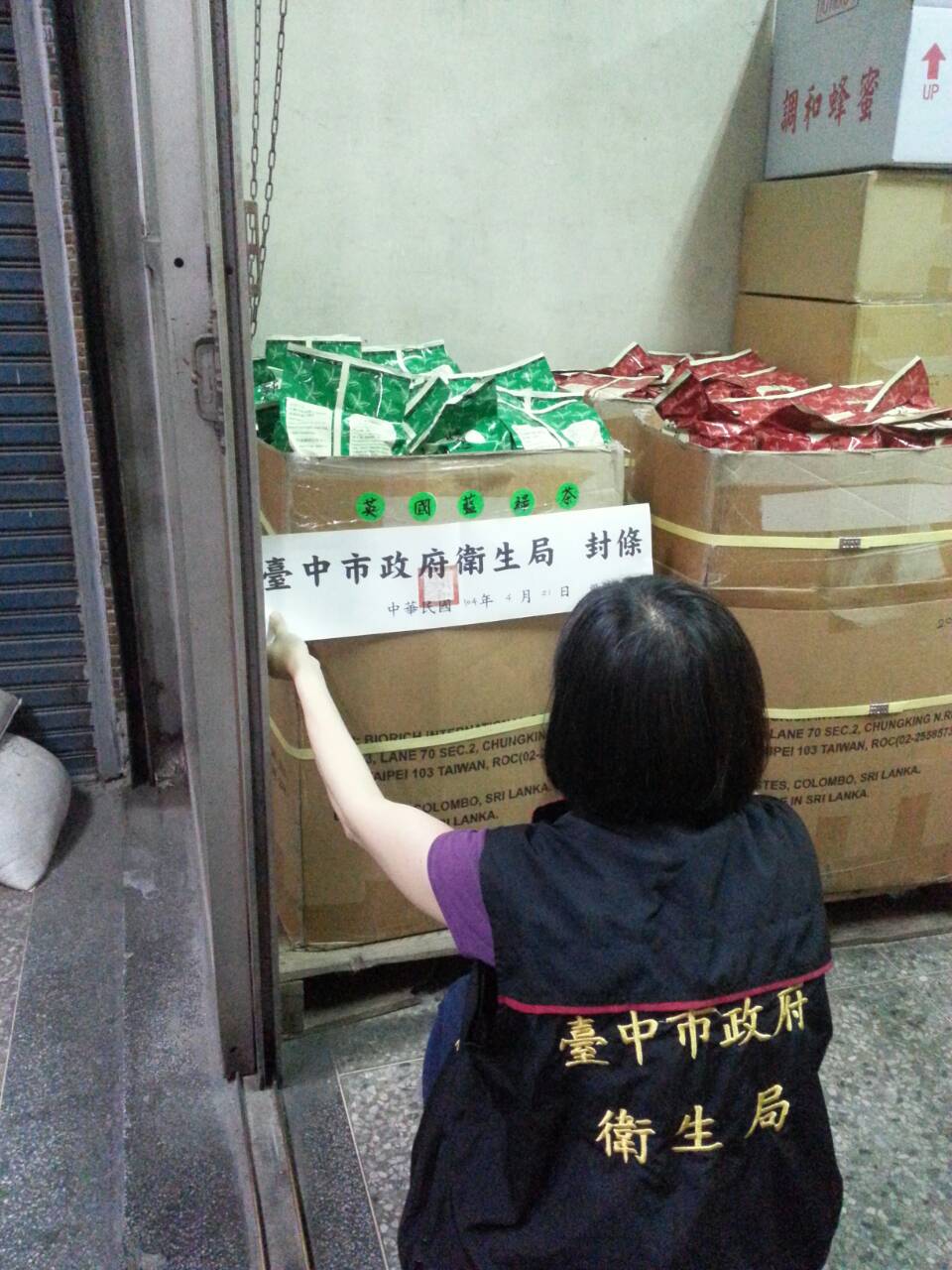 衛生局指出,21日現場封存3種疑似有農藥殘留的茶葉共302公斤(504包),包括阿薩姆紅茶166.2KG(277包,600g/包)、翡翠綠茶83.4KG(139包,600g/包)、烏龍綠茶52.8KG(88包,600g/包),已封存302公斤。(4/22*16)