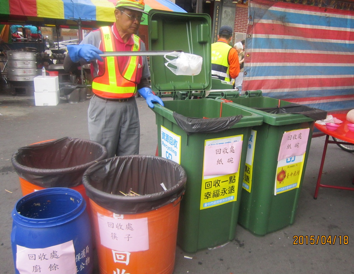 大甲媽祖遶境活動正熱烈進行中,臺中市政府環保局為協助資源回收工作,針對遶境隊伍經過的18處宮廟增設近70個資源回收桶,並對駐駕宮廟宣導點心站應加強使用可重複性清洗餐具,以落實環保。