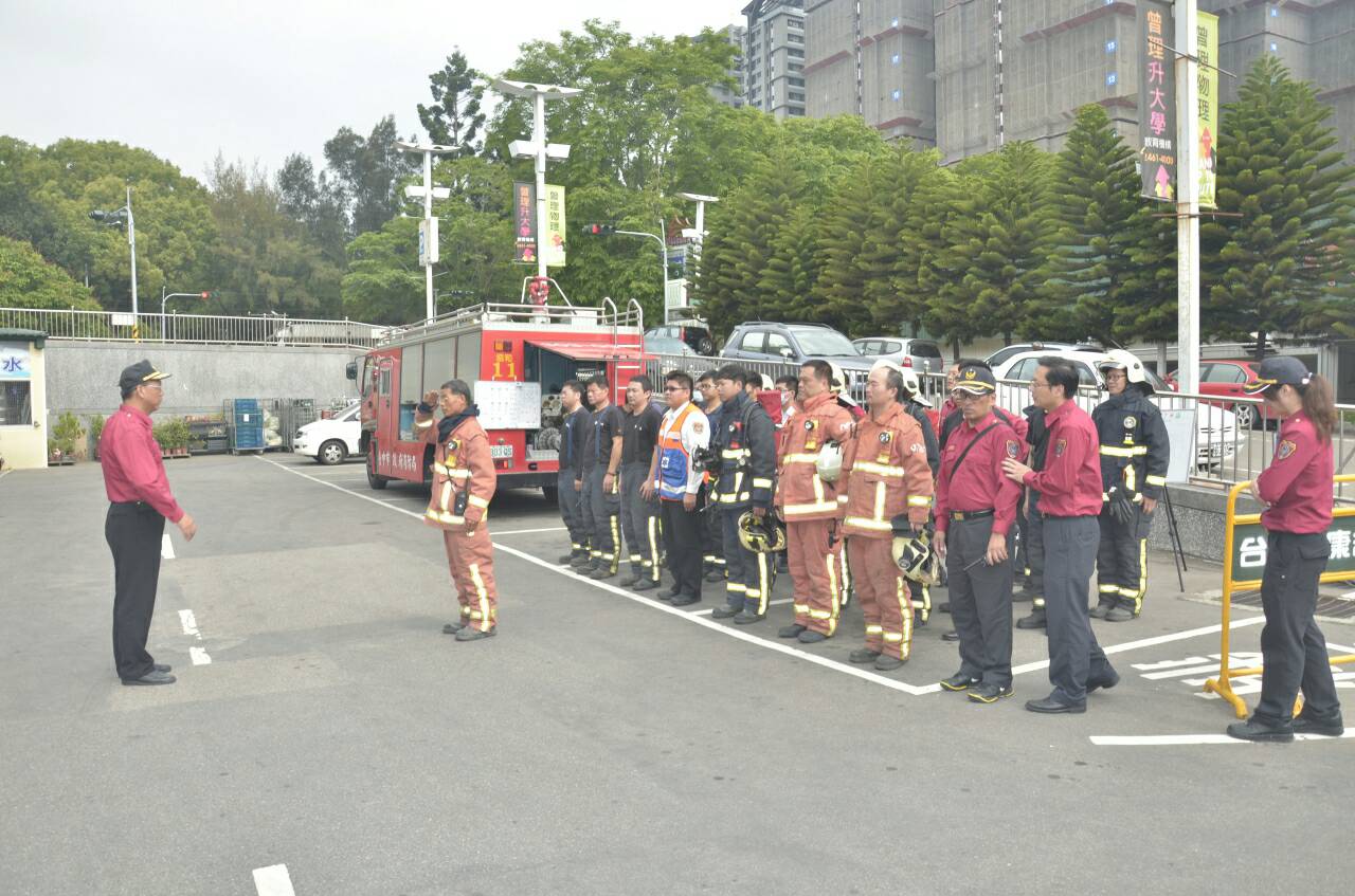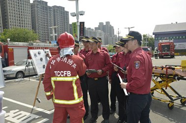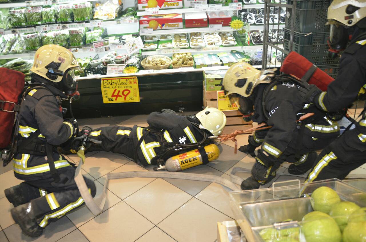 蕭局長指出,今天演練模擬民眾報案超市發生火警,有大量濃煙冒出,且疑似有人員受困,消防局接獲通報後隨即趕到現場,接著任務分配、現場救災人員安全管制、人命救助、入室搜索、防止火勢延燒、侷限火勢及滅火攻擊等,以進一步建立正確的疏散、搶救及撤離模式。