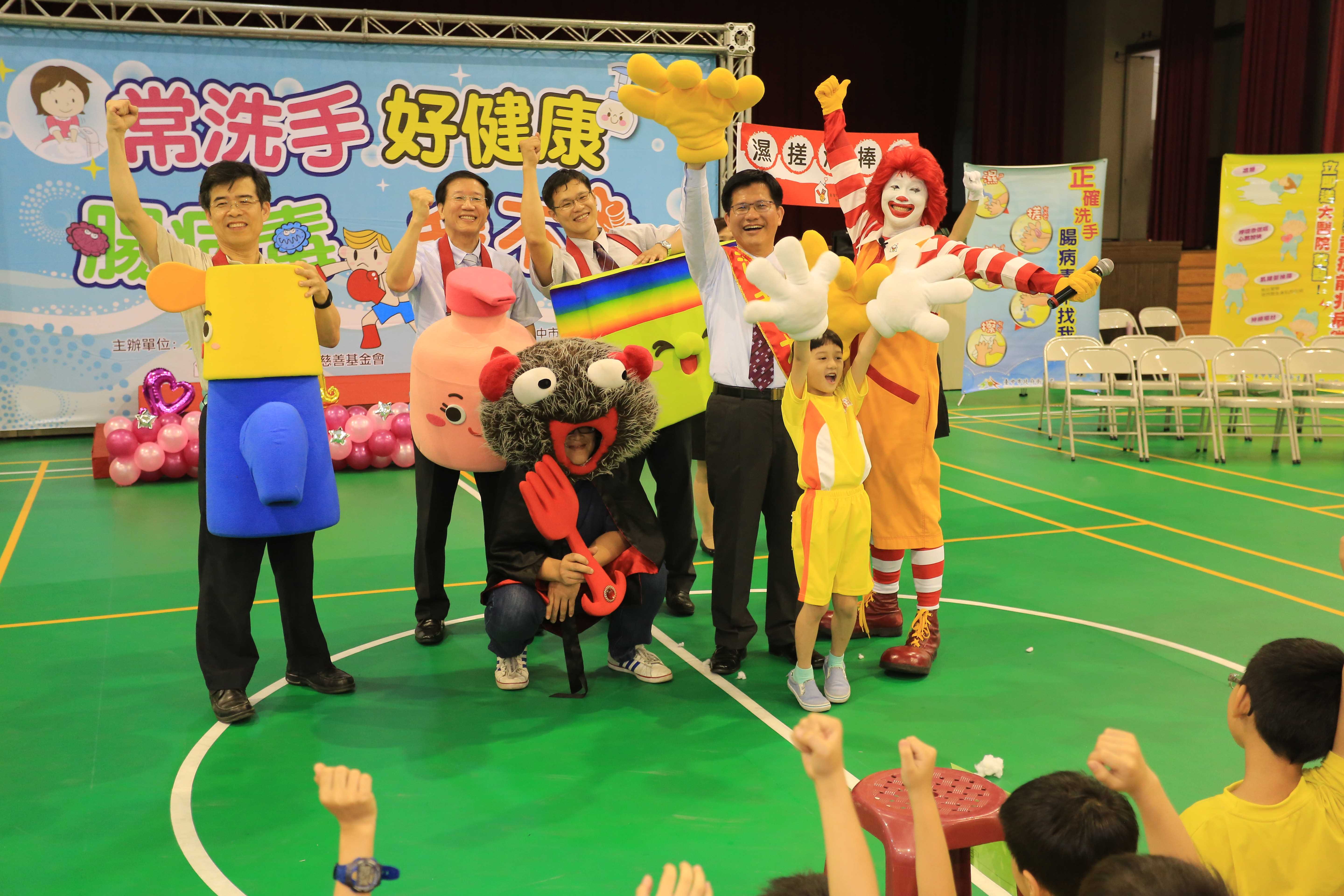 今天洗手校園宣導活動由臺中市政府衛生局舉辦,活動現場聚集大新國小小一學生,由林市長戴大手,衛生局長徐永年拿著大水龍頭,教育局長顏慶祥拿著大洗手乳,示範「濕、搓、沖、捧、擦」正確洗手五步驟,氣氛歡樂;林市長更與麥當勞叔叔一起帶領小朋友跳洗手操,快樂學習正確洗手觀念,市議員劉士州也到現場與小朋友同樂。