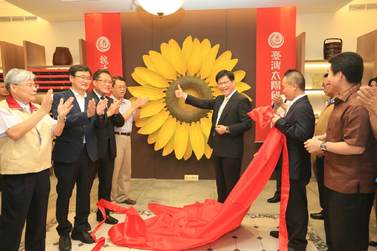 在林市長、市議員陳成添、江肇國、賴順仁、曾朝榮、經發局長呂曜志、立委員黃國書、蔡錦隆、前立委顏清標、糕餅公會理事長周子良、自由商圈主委翁羿琦等人的合作下,一起揭開大型太陽花造型意象,見證太陽餅博物館的開幕,並由臺灣太陽餅博物館執行長陳瑛宗導覽,介紹百年建築全安堂及臺中太陽餅歷史。