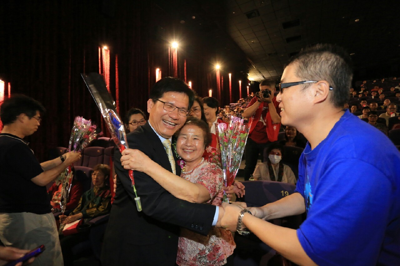林市長、市府衛生局長徐永年、精神衛生社福基金會董事長郭榮振、董事黃美娜、臺中榮總精神部主任莊凱迪、本堂診所醫師林本堂以及華威影城董事長黃瑞章等人出席這場公益電影放映會,林市長發送康乃馨給現場辛苦的身心康復者的媽媽們,並送上大大的擁抱。