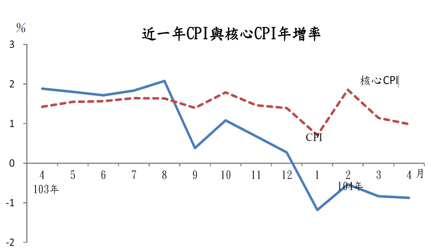 臺中市政府主計處公布4月消費者指數(CPI)為102.93,較上月上漲0.52%,較上年同月下跌0.88%,1-4月平均較上年同期下跌0.86%。