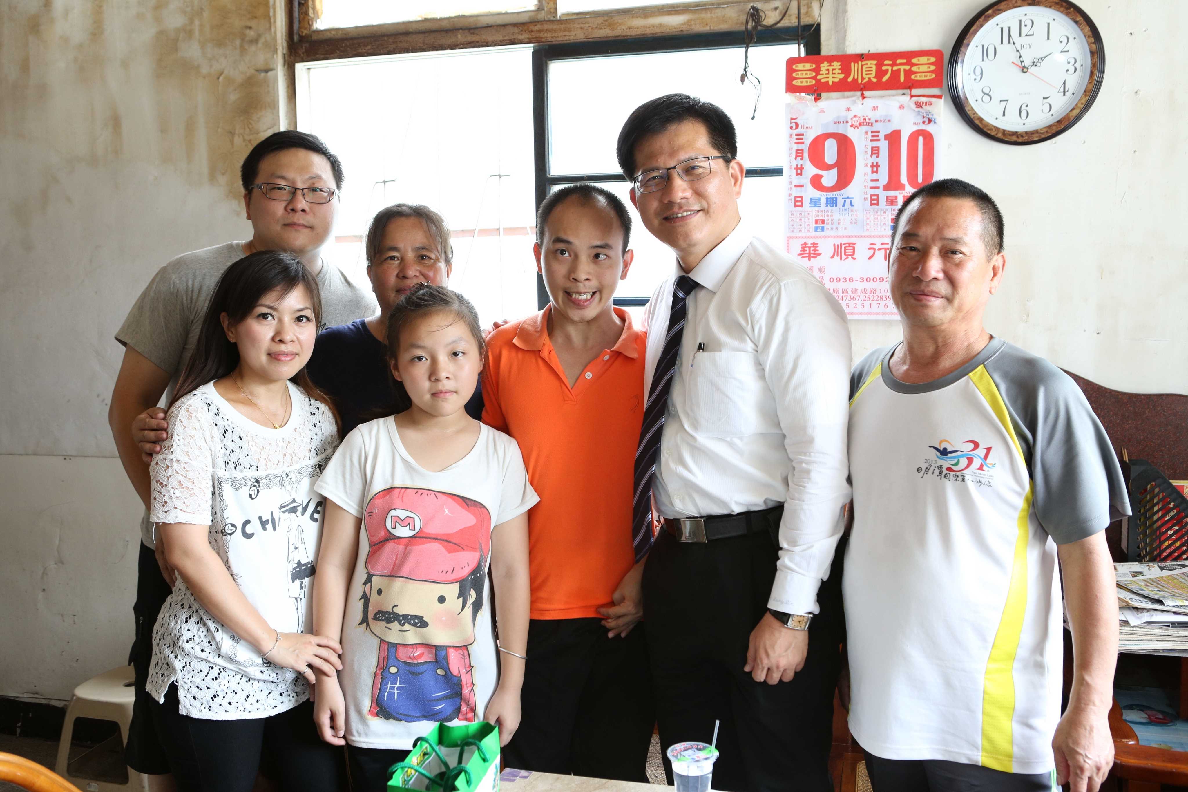 林市長今日在人事處副處長陳杉根及社會局身心障礙福利科長王麗馨的陪同下,前往家住臺中大雅的張先生家中拜訪關心,並祝張先生的媽媽「母親節快樂」。