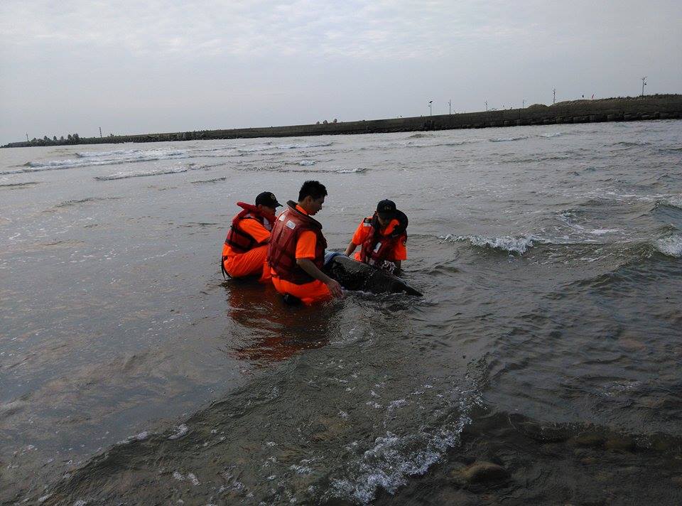 市府農業局表示,今日下午接獲通報後,市府人員、行政院海岸巡防署海岸巡防總局中部地區巡防局第三海岸巡防總隊松柏漁港安檢所、中華鯨豚協會、成功大學等人員皆至現場救援。