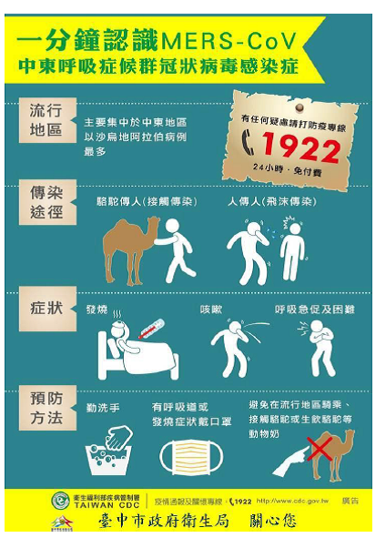 衛生局呼籲民眾,應注意個人衛生、呼吸道防護及手部清潔,如至中東地區旅遊,也要避免騎乘或接觸駱駝及勿生飲駱駝等動物奶,以降低受感染的可能性,返國時如出現不適請立刻配戴口罩就醫,如有任何疑慮請打1922免費防疫專線,也可上衛生局網頁查詢http://www.health.taichung.gov.tw/。