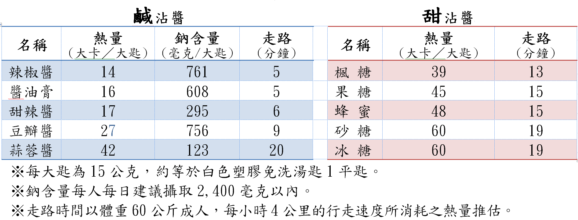衛生局指出,醬料中的鈉含量較高,辣椒醬每大匙約含鈉761毫克,3匙就逼近每日建議攝取量(2,400毫克)上限,鈉攝取過多會有水腫、高血壓,也可能增加心臟病、中風風險,建議民眾注意用量。