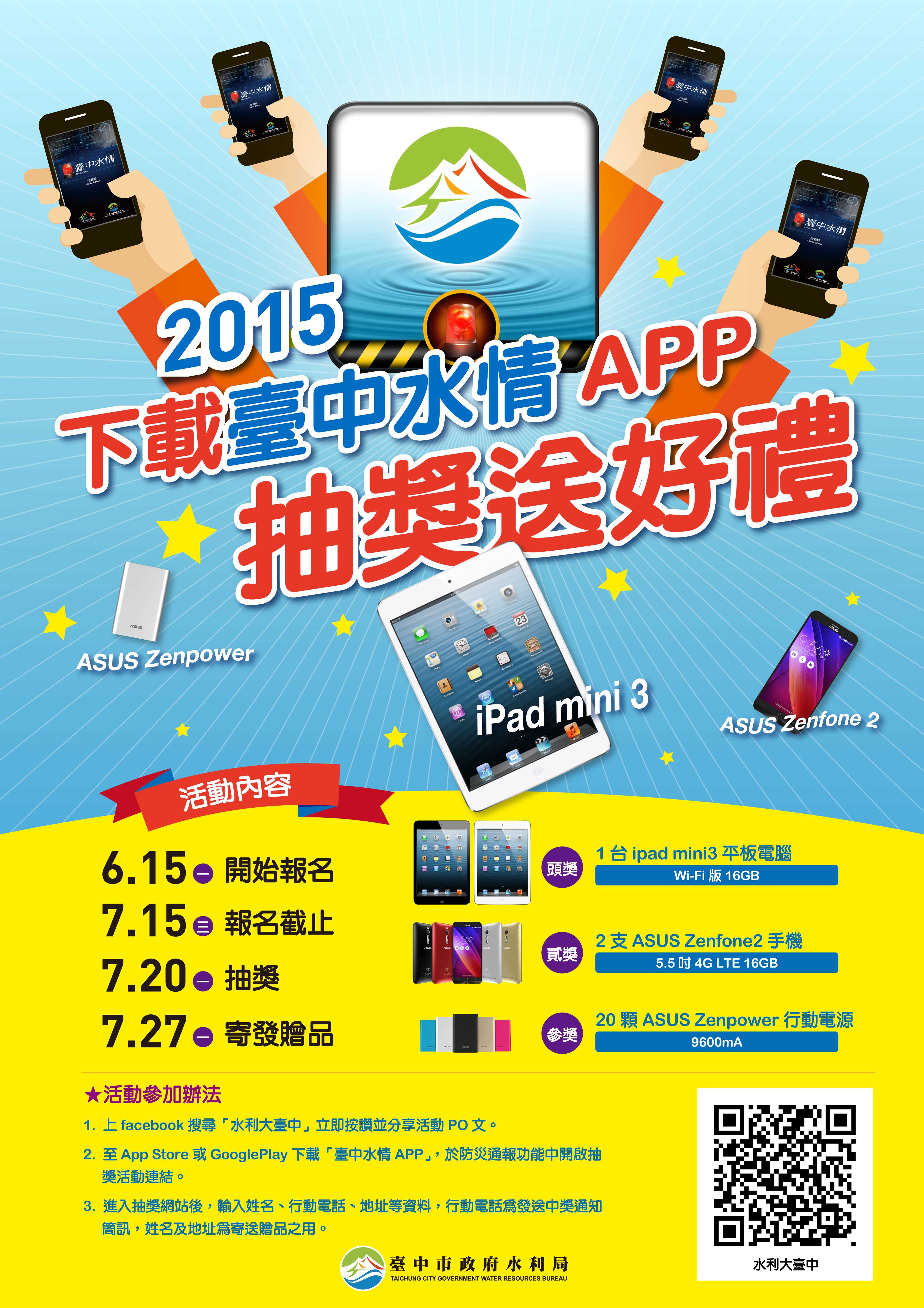 這次活動獎品包含1台iPad mini 3平板電腦、2支5.5吋ASUS Zenpone2手機及20顆ASUS Zenpower行動電源,歡迎台中市或外縣市民踴躍下載使用,詳情請參閱活動網站http://www.wrbeoc.taichung.gov.tw。
