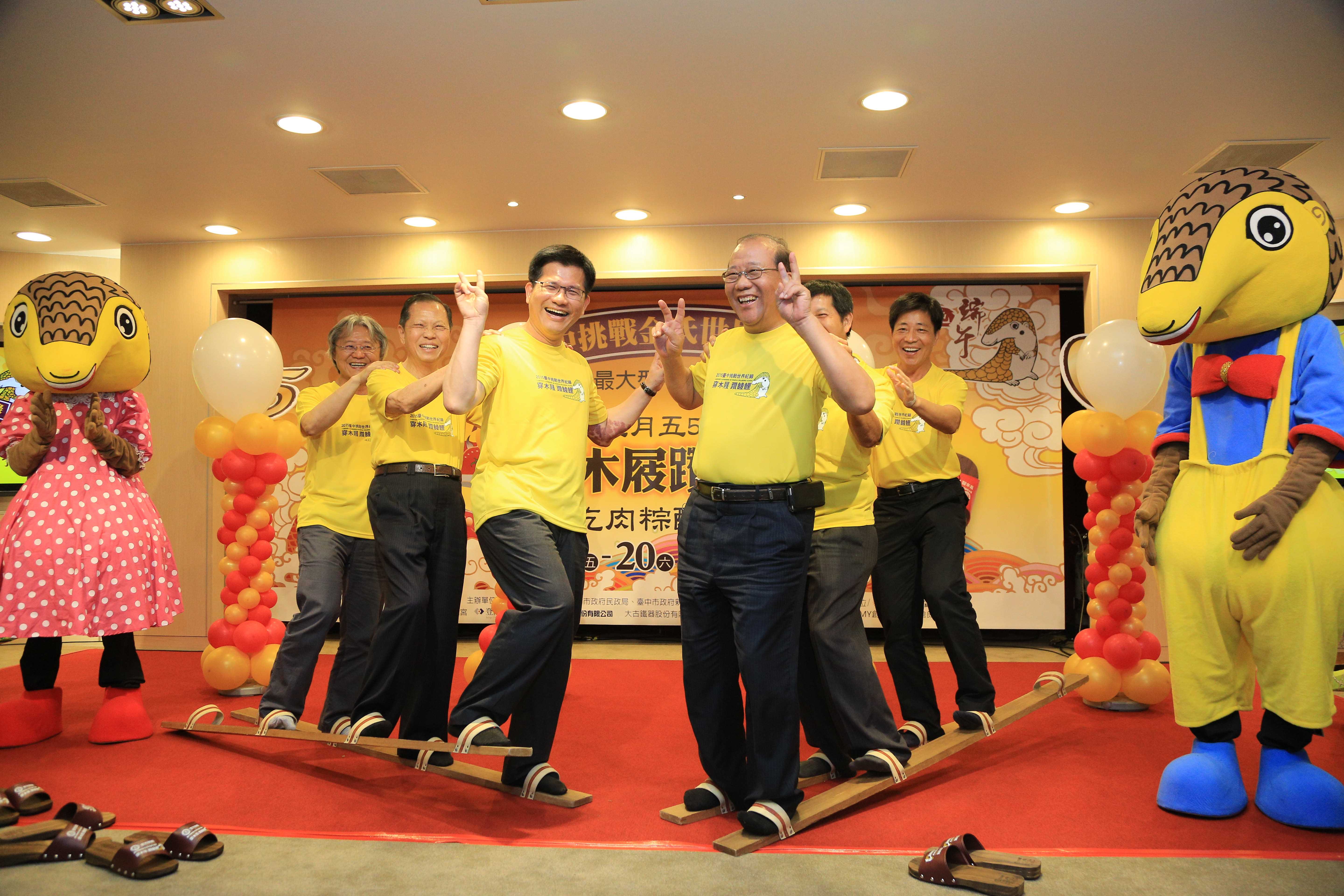 台中市政府文化局、新聞局、民政局、觀光旅遊局等局處今年與南屯區萬和宮合作舉辦「2015臺中市五五慶端午─犁頭店穿木屐躦鯪鲤系列活動」,今(15)日於台灣大道市政大樓舉行宣傳記者會,包括林市長、文化局長王志誠、市議員劉士州、萬和宮董事長蕭清杰、南屯區長程泰源、南屯里長林秋潭等人一起體驗穿木屐走路的樂趣,並在吉祥物穿山甲「咖咖」的陪同下一起刺破氣球,秀出5500數字,象徵挑戰全世界最大型的木屐聚會。