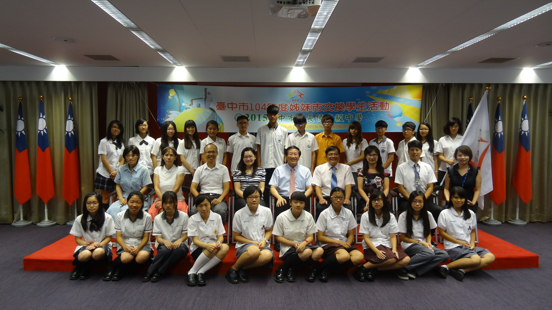 市府教育局長顏慶祥表示,出國學習是人生難得的機會,能開拓國際視野,過程中難免會想家,但這段經驗也能讓人更加認識自己,對往後的人生將能帶來一定幫助;這次的交換學生都是台中市的外交小尖兵,希望大家都能快樂學習,並將台灣及台中的好與美行銷出去,他並祝福大家此行平安順利。