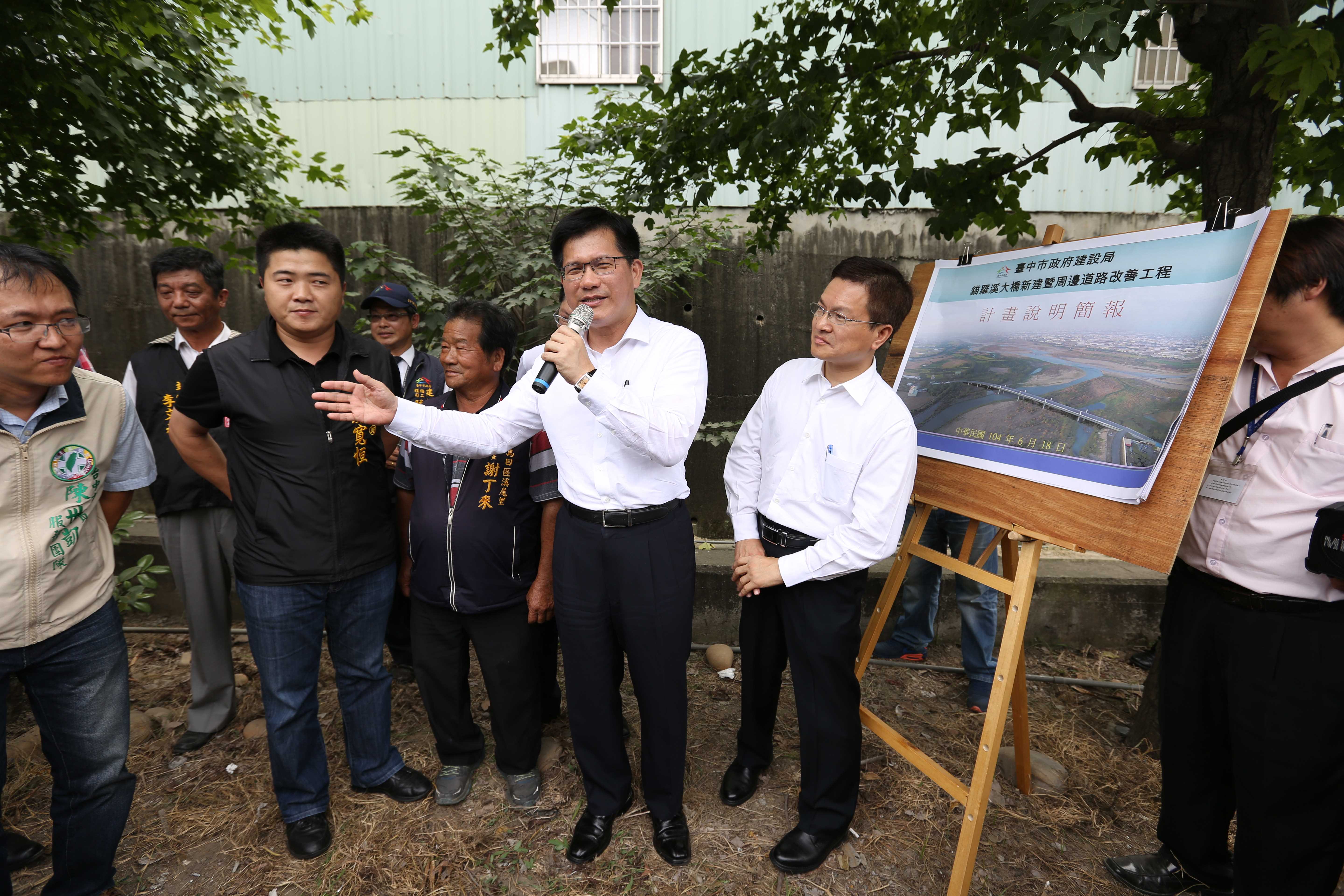 林市長今(18)日前往貓羅溪大橋工程預定地進行現勘並聽取建設局簡報,並與彰化縣長魏明谷、立法委員顏寬恒、經濟部次長楊偉甫、公路總局副局長夏明勝等人一同勘查現有的鋼構便橋。林市長表示,中彰共同生活圈已逐漸形成,而貓羅溪大橋將成為中彰的區域治理指標。